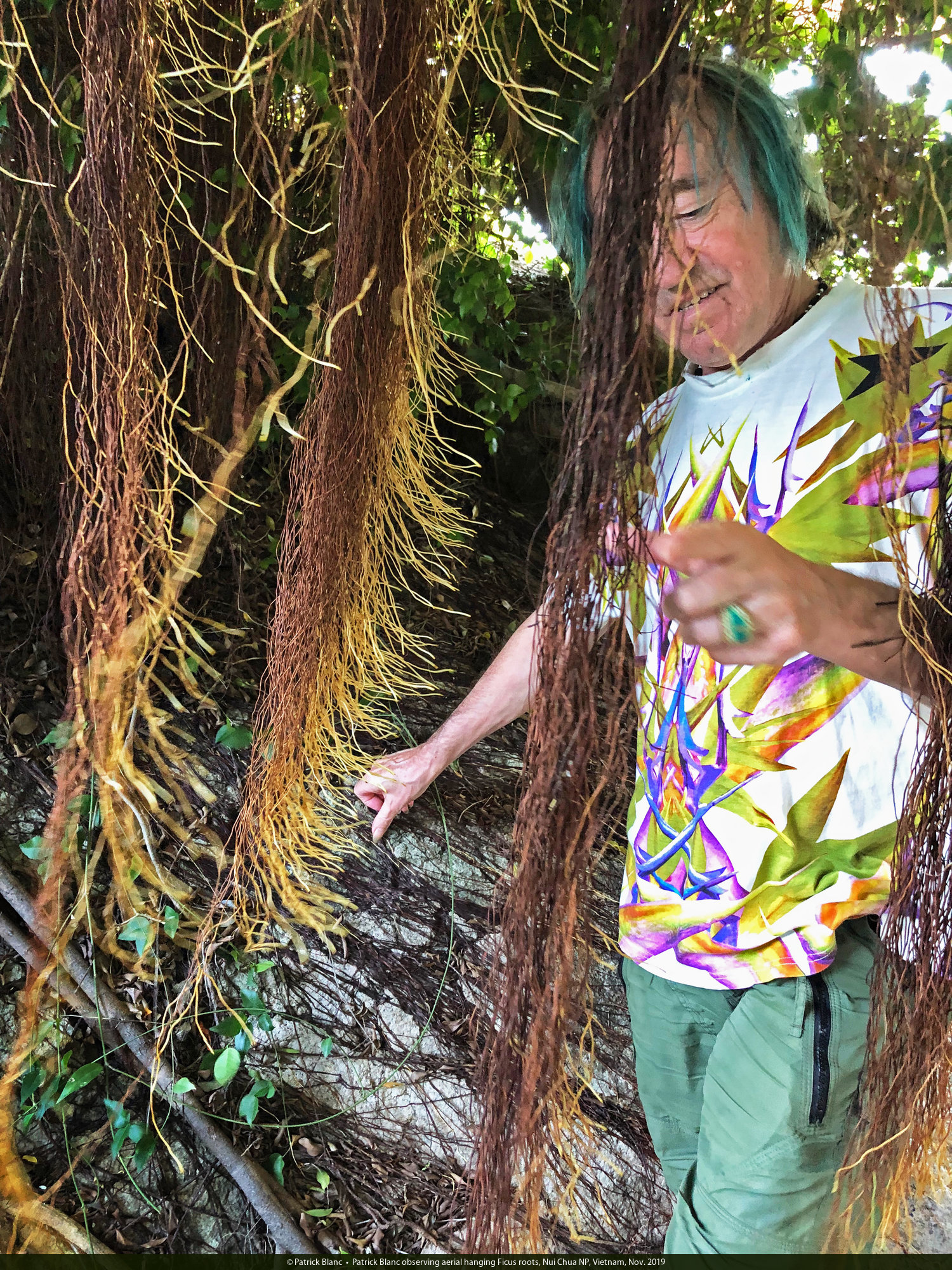 Patrick Blanc observing aerial hanging Ficus roots, Nui Chua NP, Vietnam, Nov. 2019