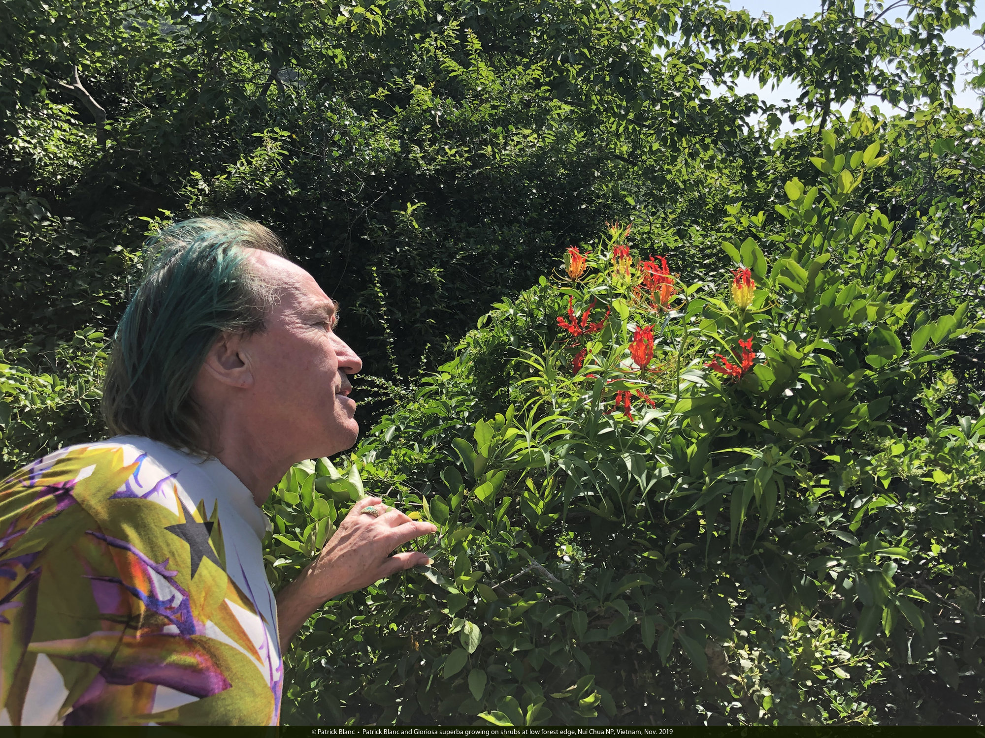 Patrick Blanc and Gloriosa superba growing on shrubs at low forest edge, Nui Chua NP, Vietnam, Nov. 2019