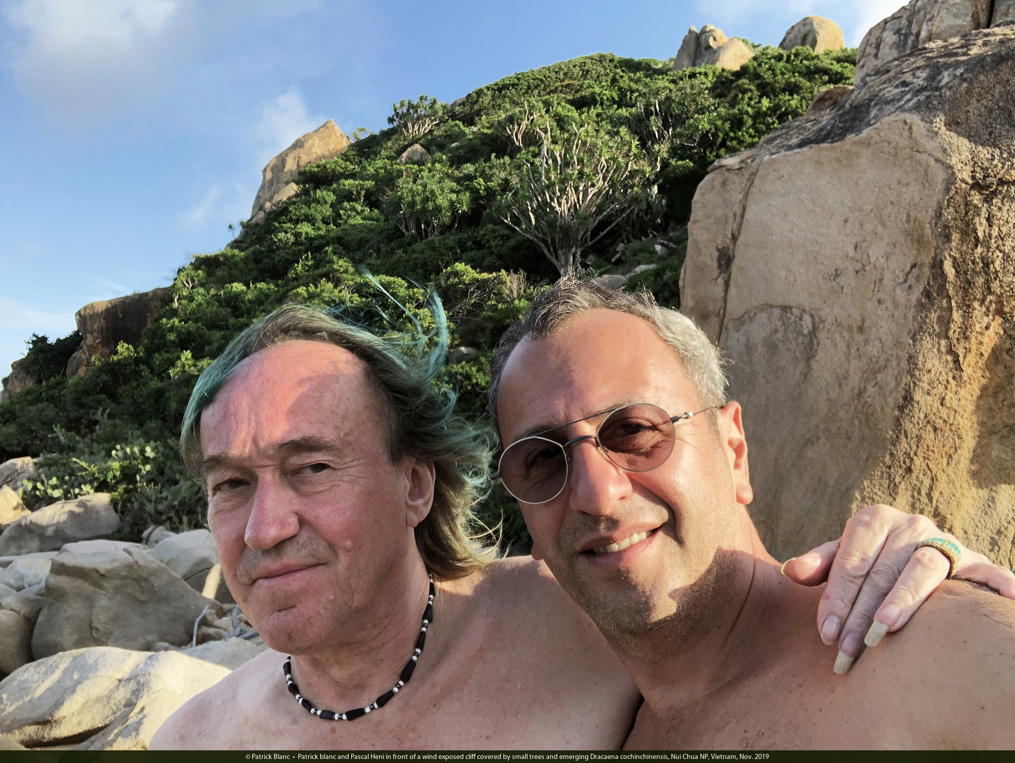 Patrick blanc and Pascal Heni in front of a wind exposed cliff covered by small trees and emerging Dracaena cochinchinensis, Nui Chua NP, Vietnam, Nov. 2019