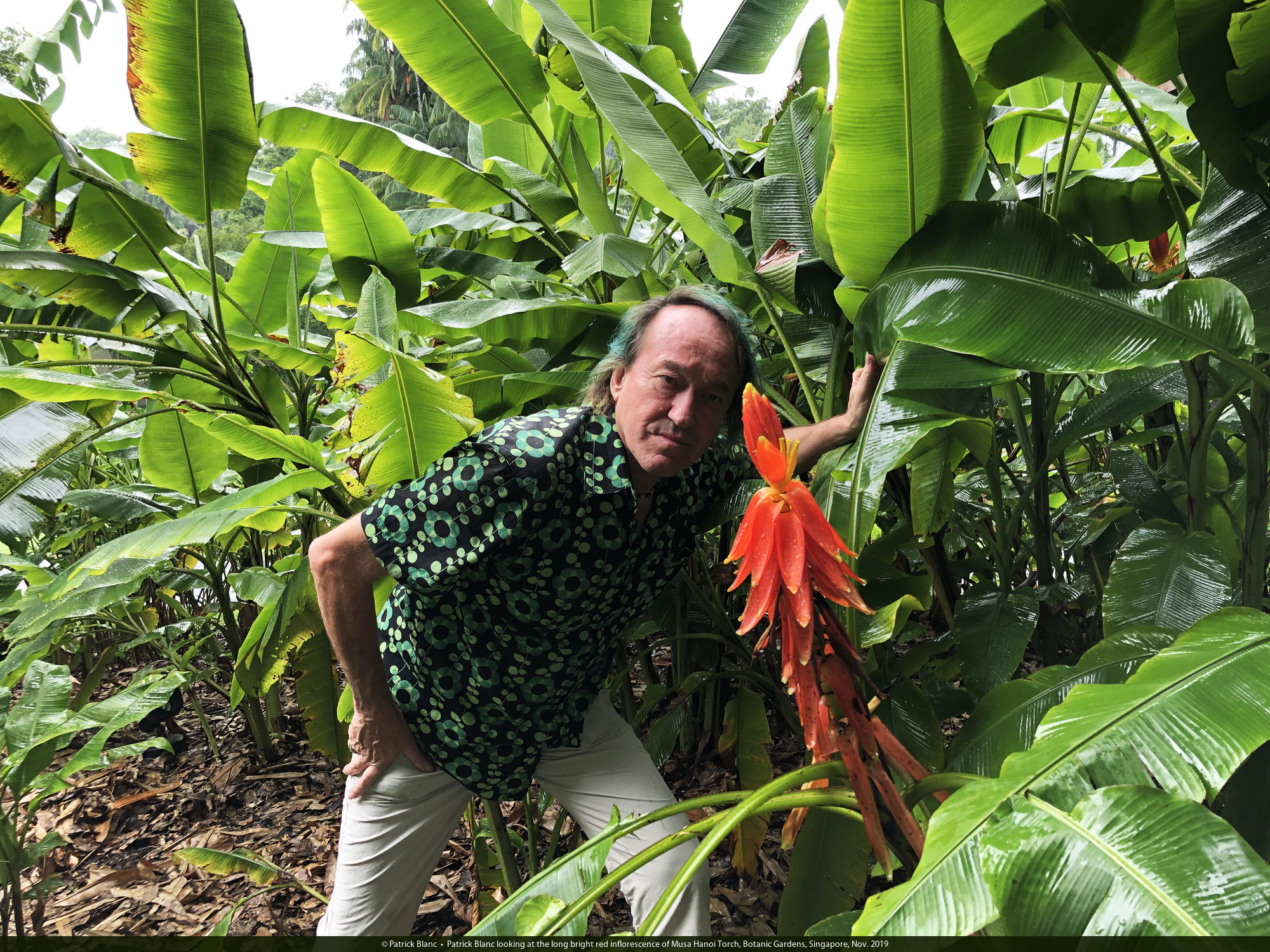 Patrick Blanc looking at the long bright red inflorescence of Musa Hanoi Torch, Botanic Gardens, Singapore, Nov. 2019