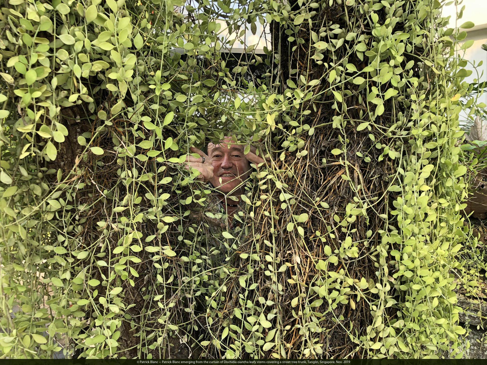 Patrick Blanc emerging from the curtain of Dischidia oiantha leafy stems covering a street tree trunk, Tanglin, Singapore, Nov. 2019