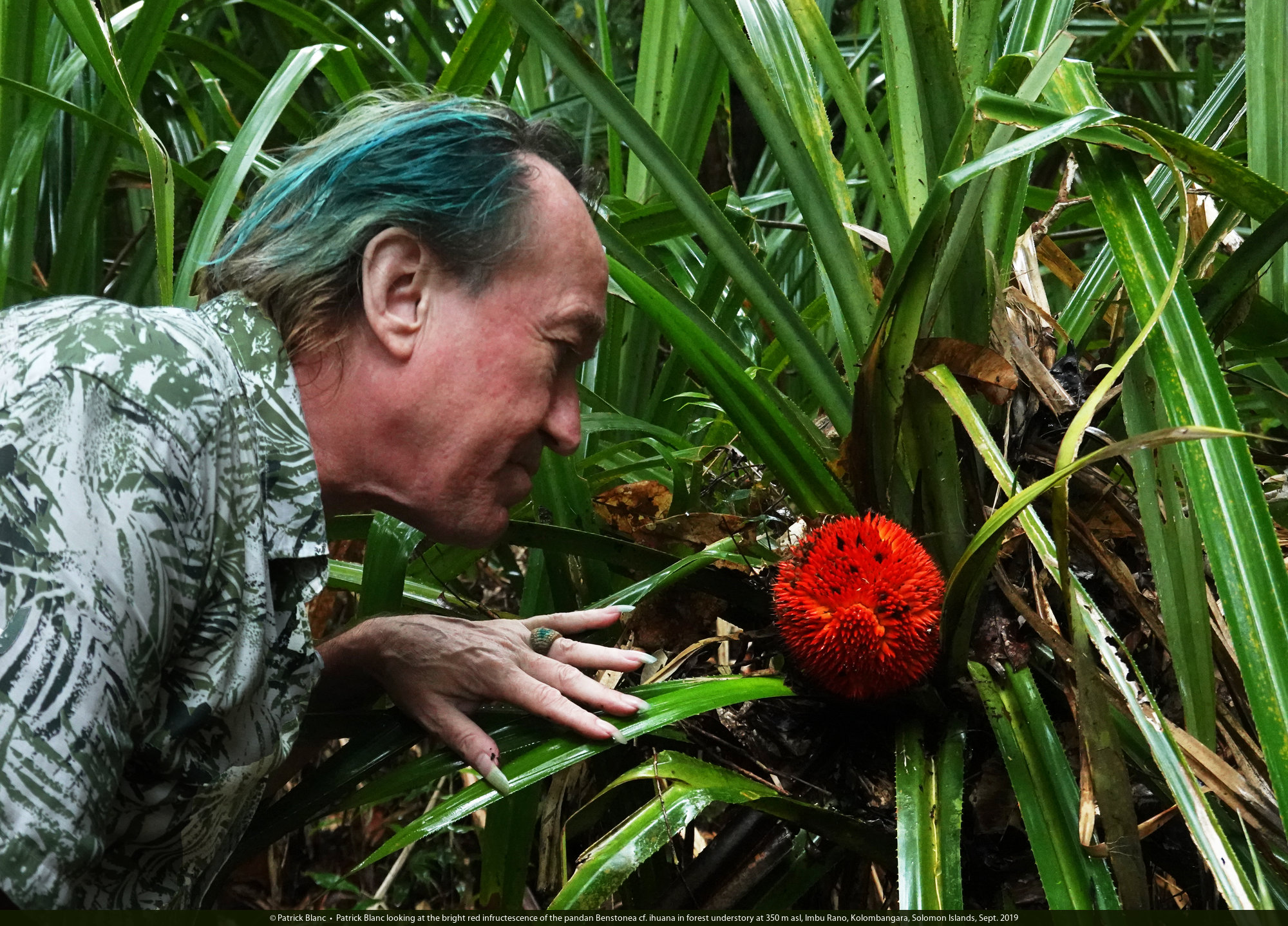 Patrick Blanc looking at the bright red infructescence of the pandan Benstonea cf. ihuana in forest understory at 350 m asl, Imbu Rano, Kolombangara, Solomon Islands, Sept. 2019