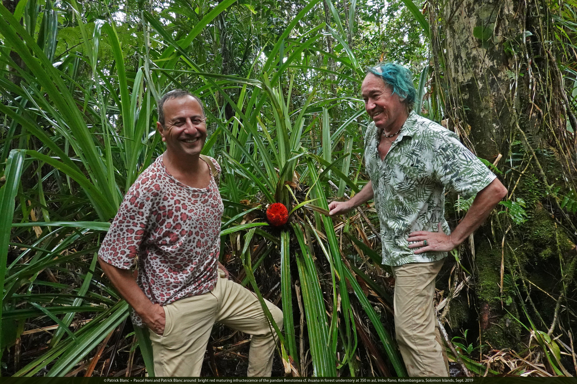 Pascal Heni and Patrick Blanc around bright red maturing infructescence of the pandan Benstonea cf. ihuana in forest understory at 350 m asl, Imbu Rano, Kolombangara, Solomon Islands, Sept. 2019