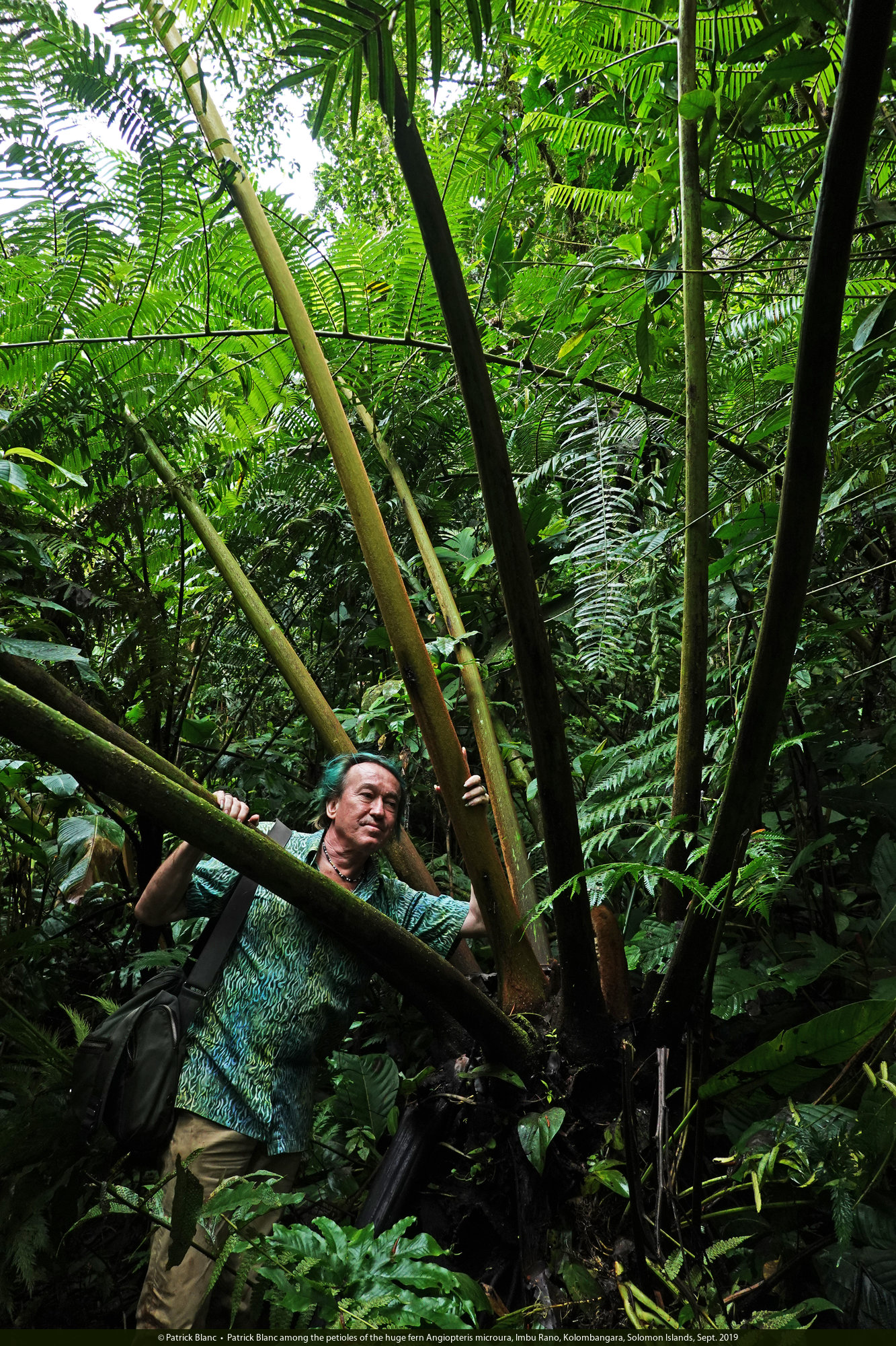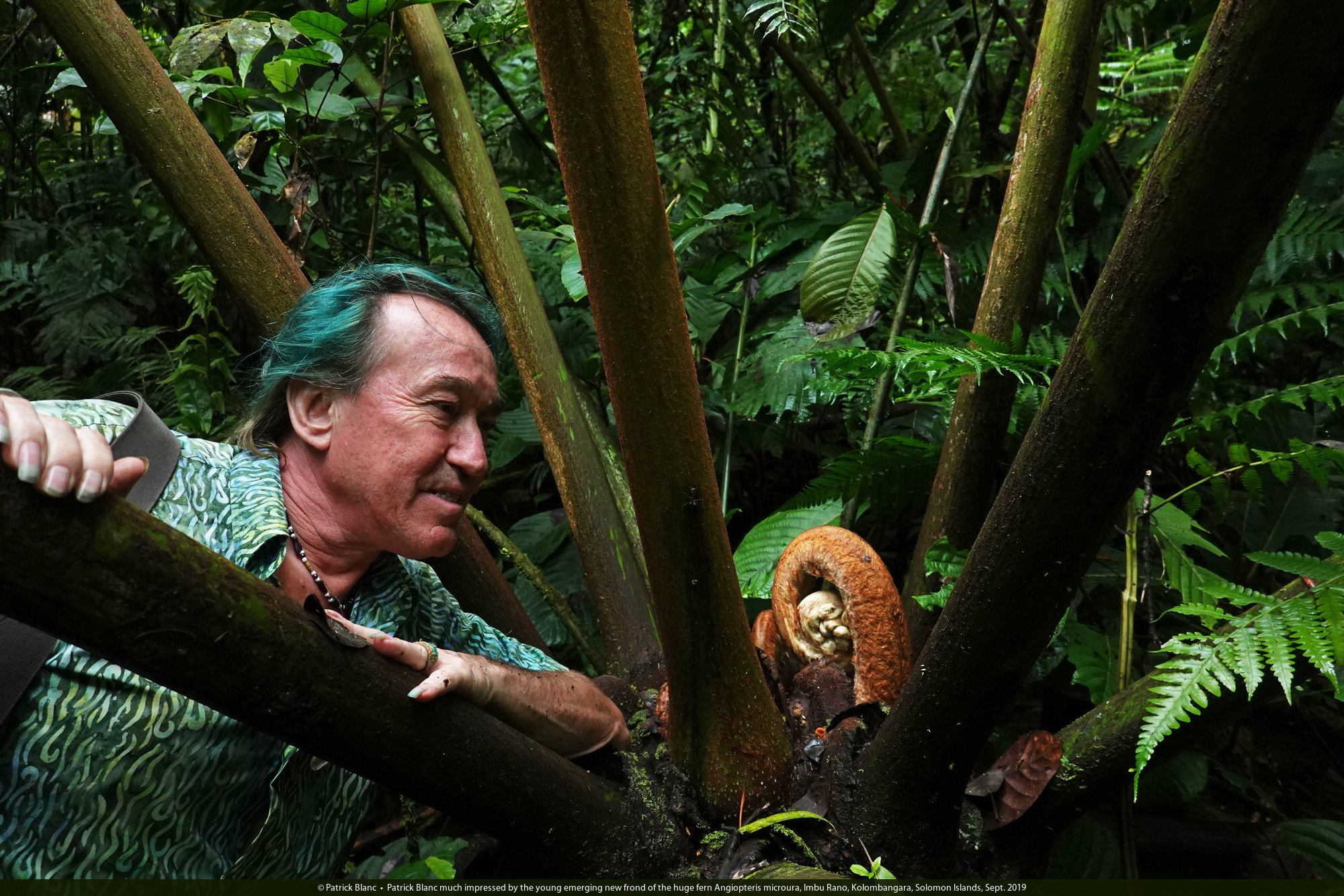 Patrick Blanc among the petioles of the huge fern Angiopteris microura, Imbu Rano, Kolombangara, Solomon Islands, Sept. 2019