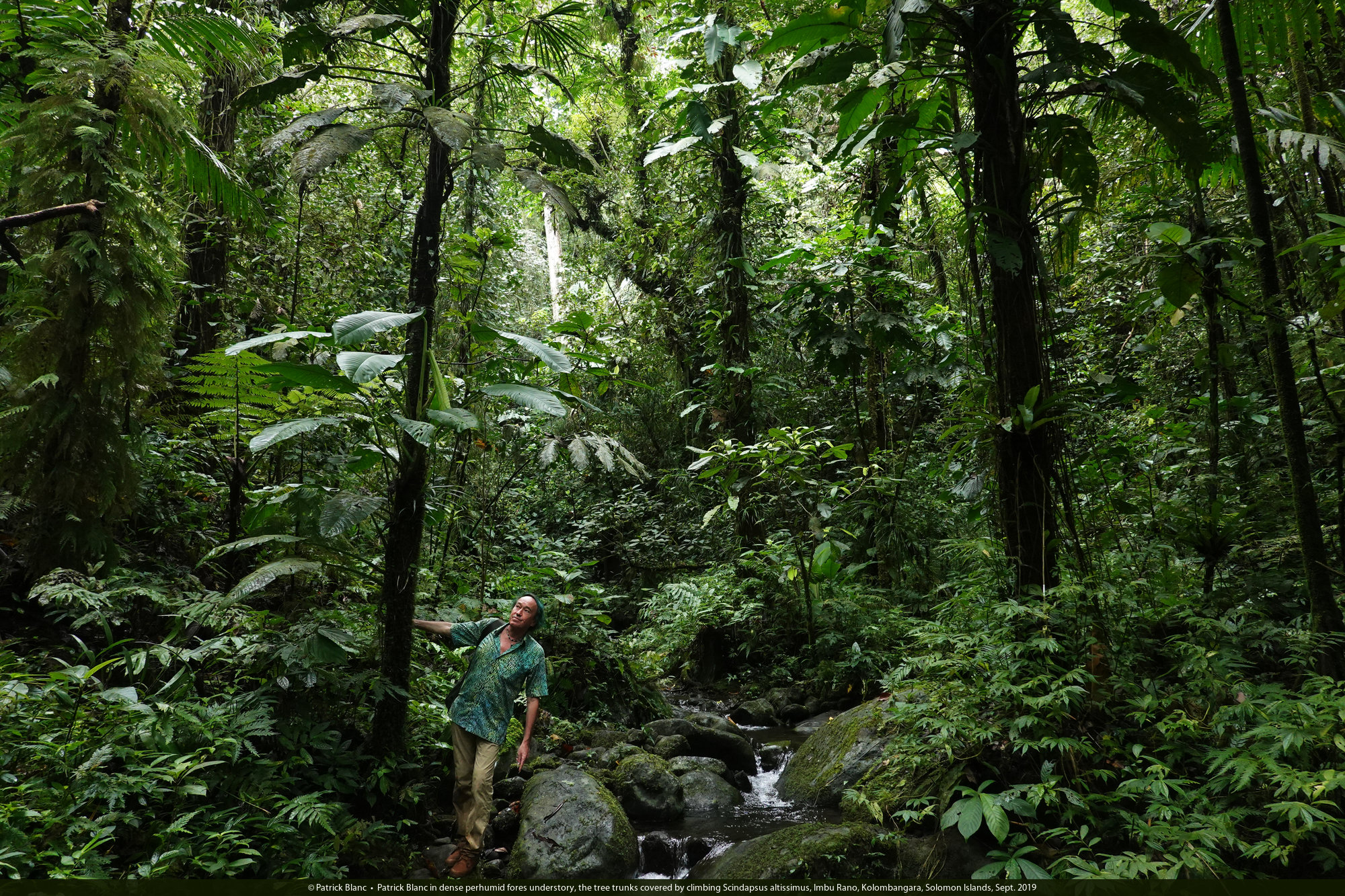 Patrick Blanc in forest understory, the tree trunks covered by the climbing Scindapsus altissimus, Imbu Rano, Kolombangara, Solomon Islands, Sept. 2019