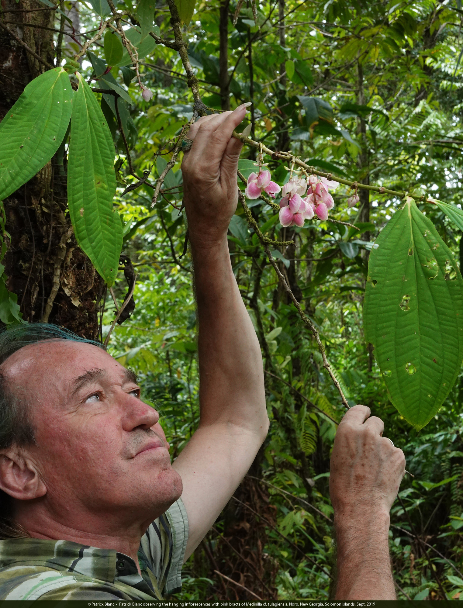 Patrick Blanc observing the hanging inflorescences with pink bracts of Medinilla cf. tulagiensis, Noro, New Georgia, Solomon Islands, Sept. 2019