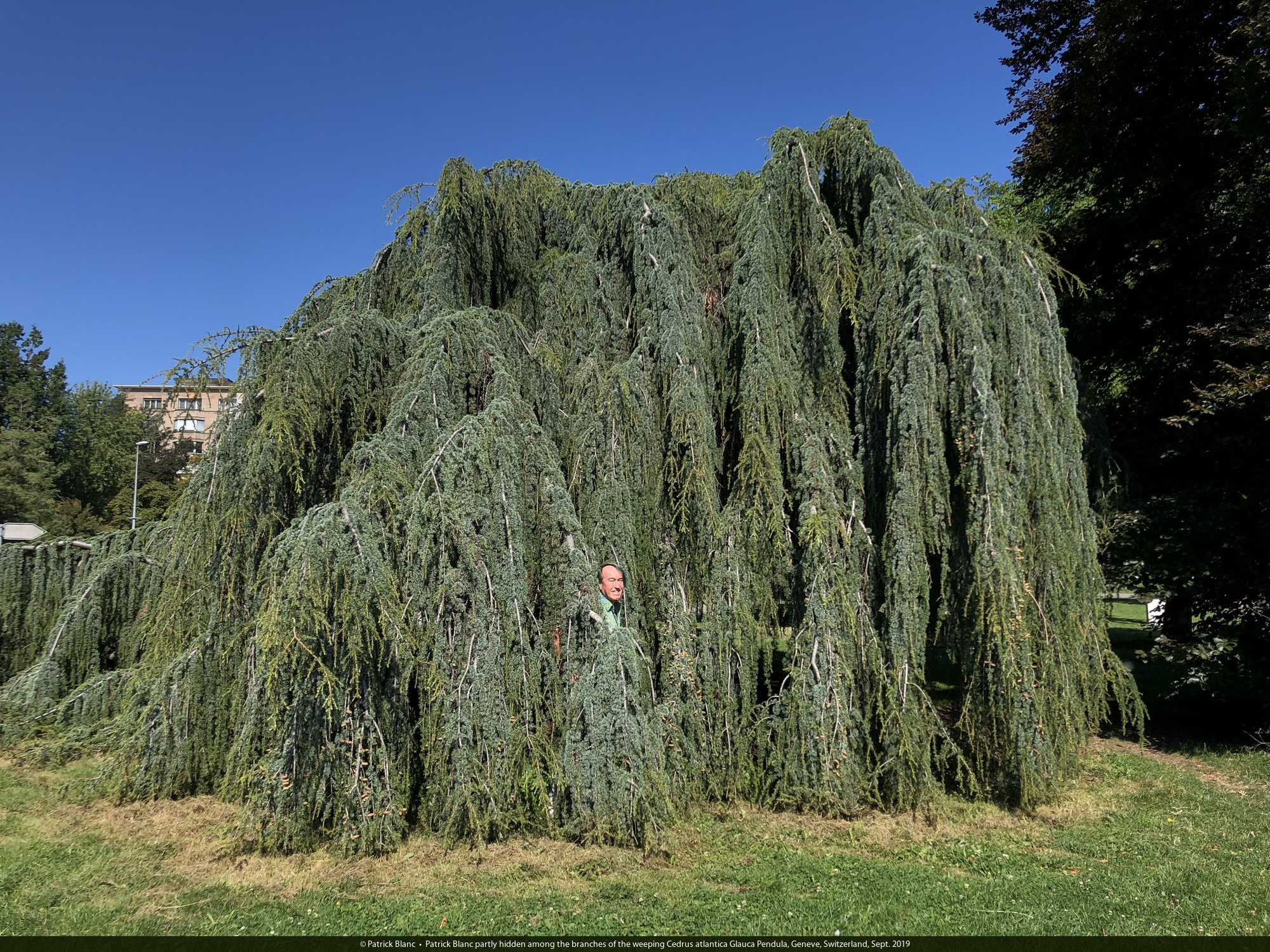 Patrick Blanc partly hidden among the branches of the weeping Cedrus atlantica Glauca Pendula, Geneve, Switzerland, Sept. 2019