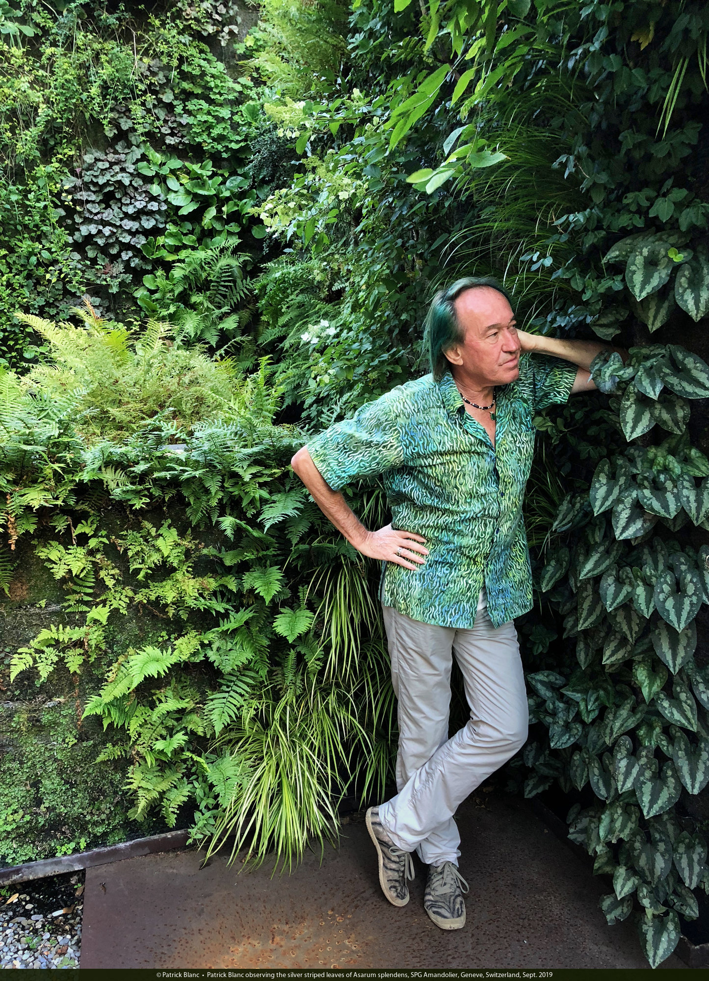 Patrick Blanc observing the silver striped leaves of Asarum splendens, SPG Amandolier, Geneve, Switzerland, Sept. 2019