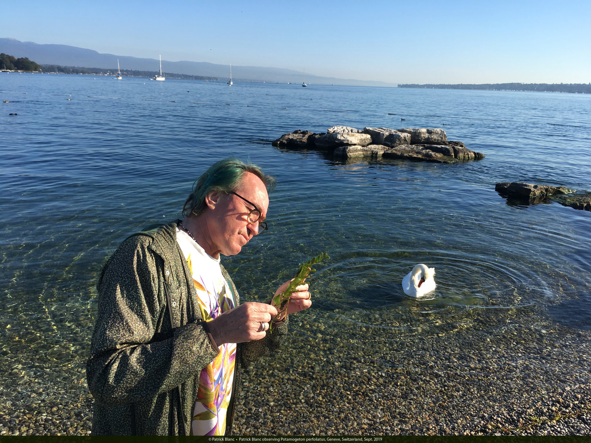Patrick Blanc observing Potamogeton perfoliatus, Geneve, Switzerland, Sept. 2019