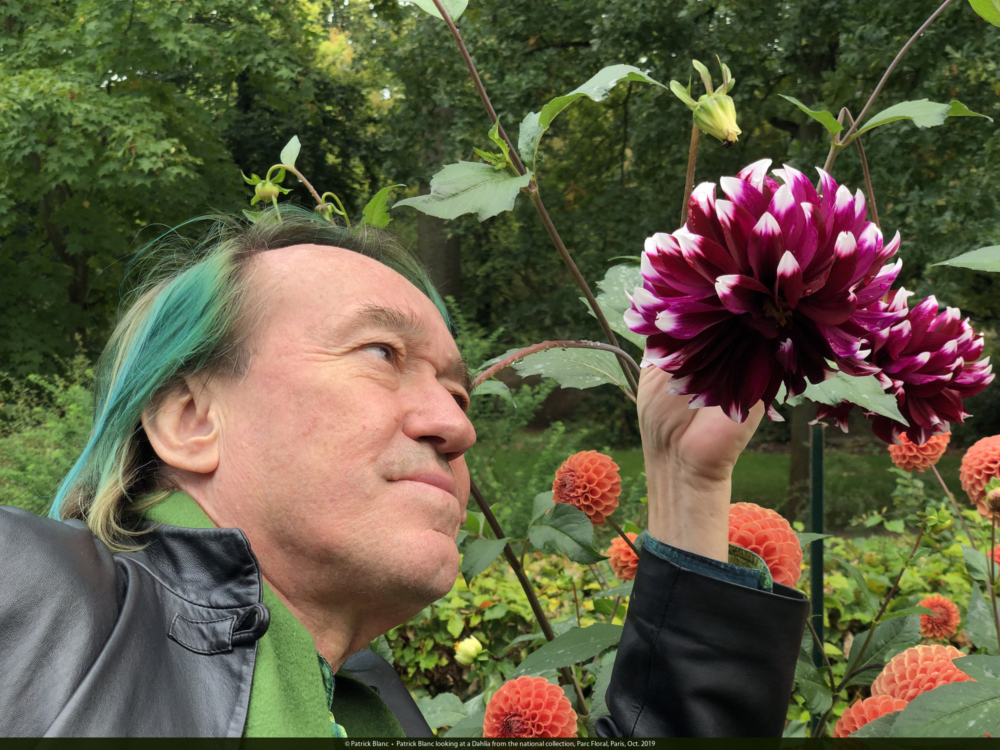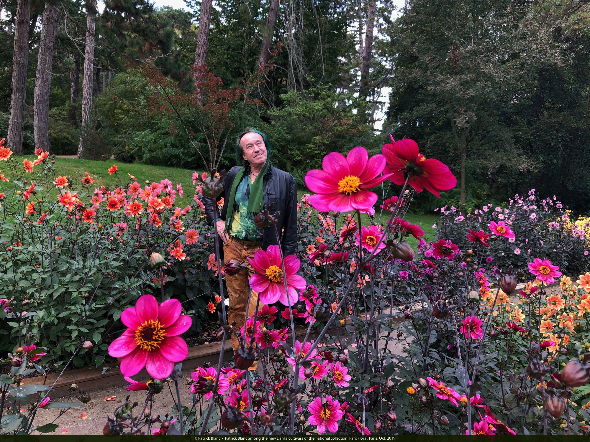 Patrick Blanc among the new Dahlia cultivars of the national collection, Parc Floral, Paris, Oct. 2019