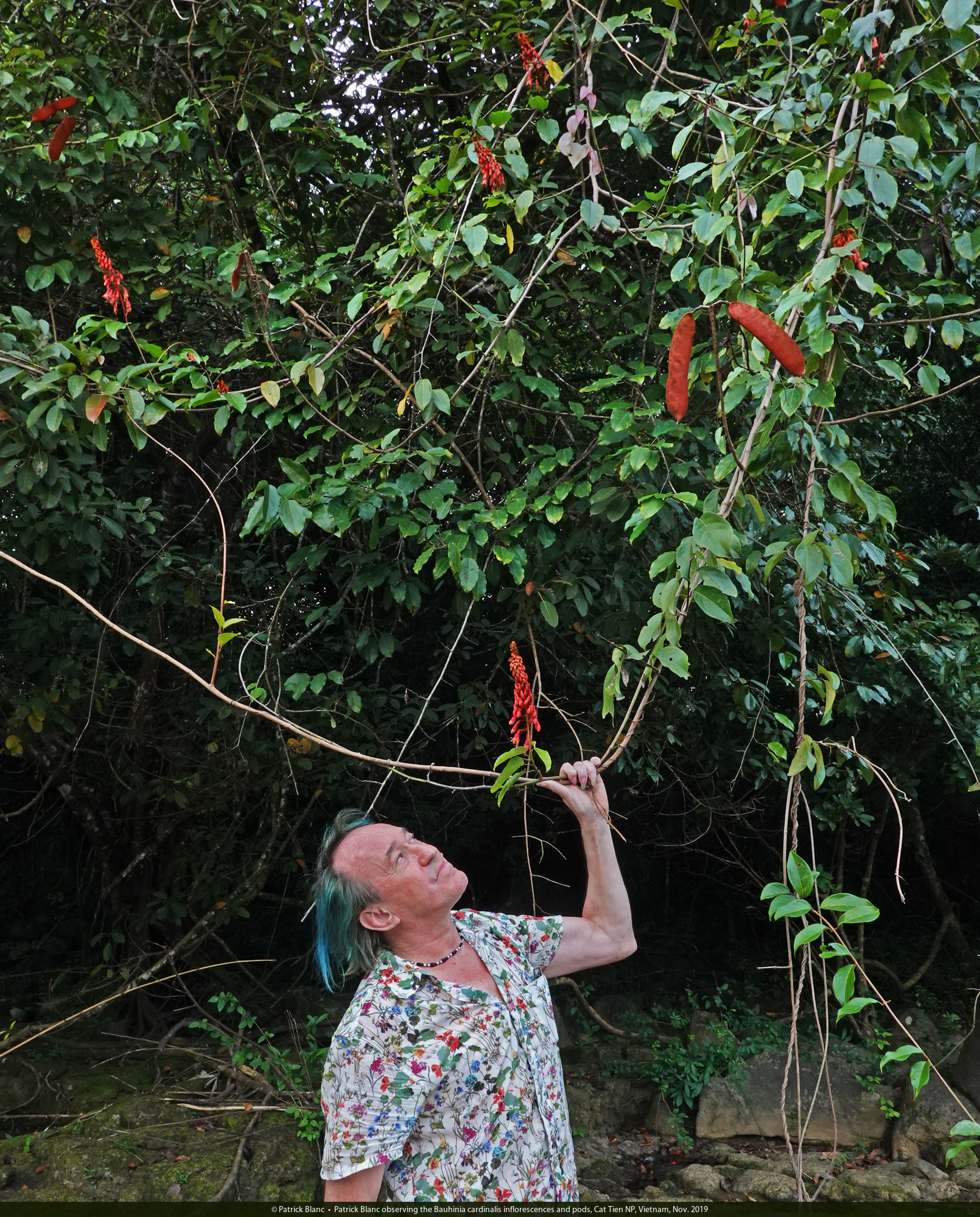 Patrick Blanc observing the erect inflorescence of Bauhinia cardinalis, Cat Tien NP, Vietnam, Nov. 2019