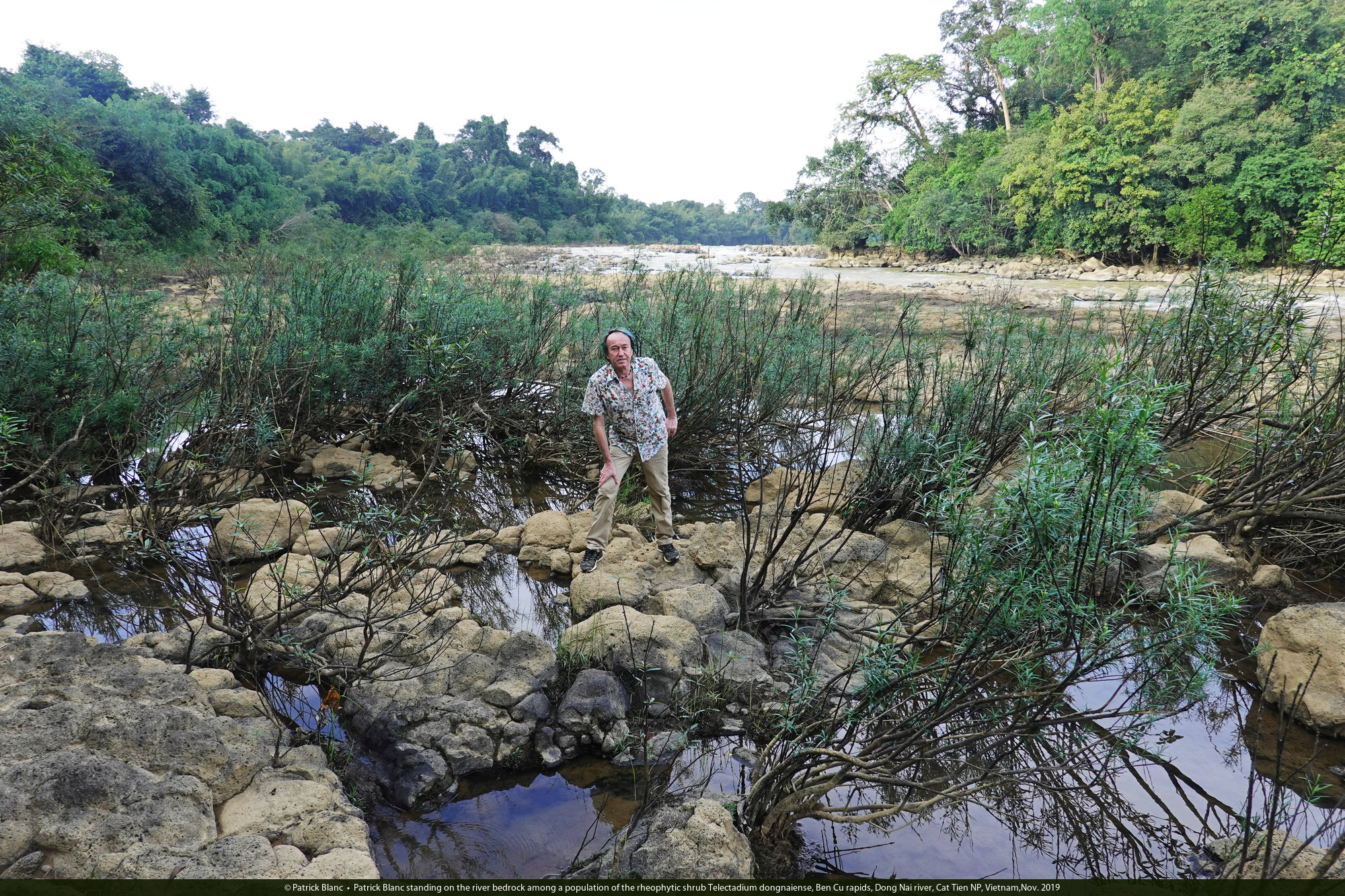 Patrick Blanc standing on the river bedrock among a population of the rheophytic shrub Telectadium dongnaiense, Ben Cu rapids, Dong Nai river, Cat Tien NP, Vietnam,Nov. 2019
