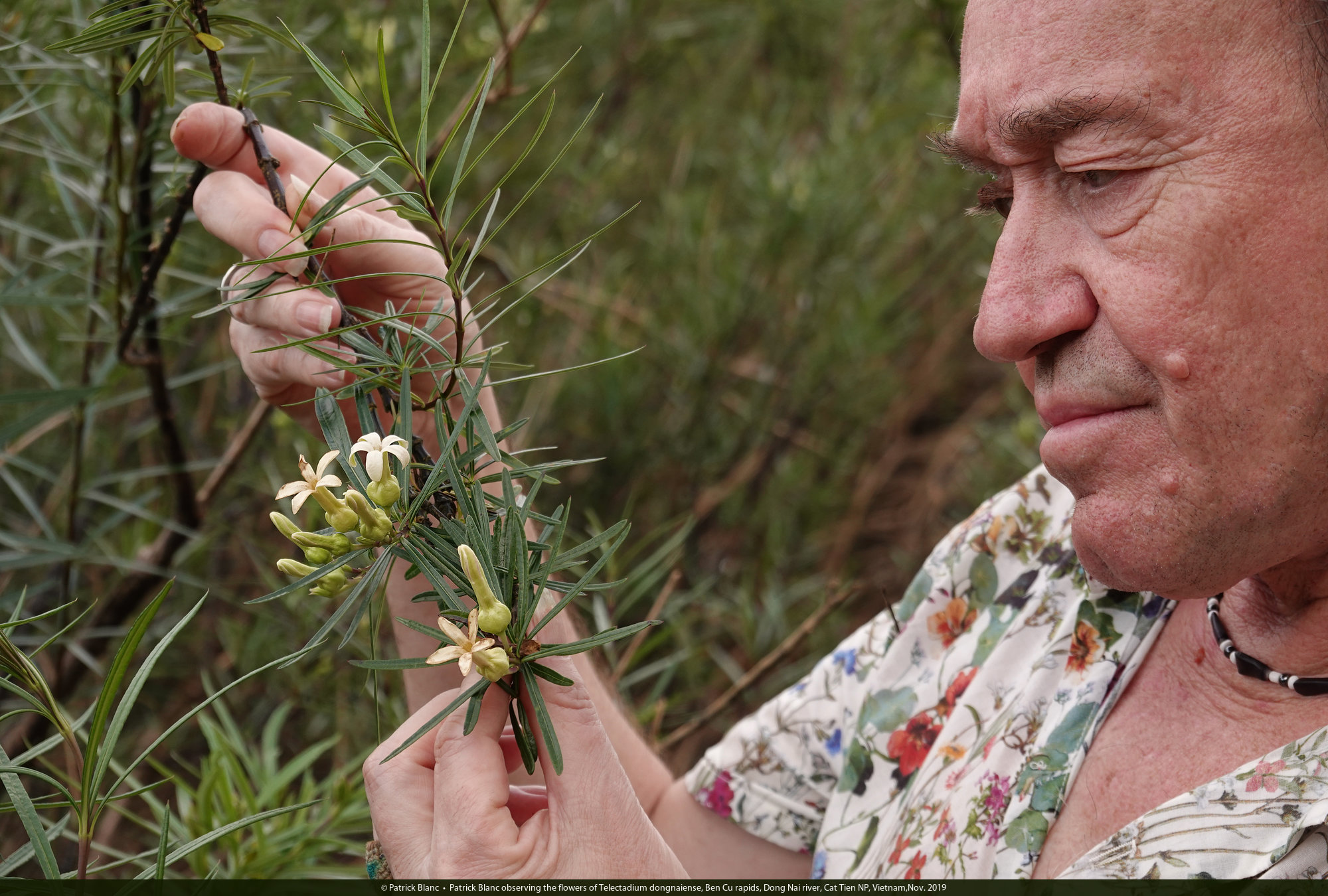 Patrick Blanc observing the flowers of Telectadium dongnaiense, Ben Cu rapids, Dong Nai river, Cat Tien NP, Vietnam,Nov. 2019