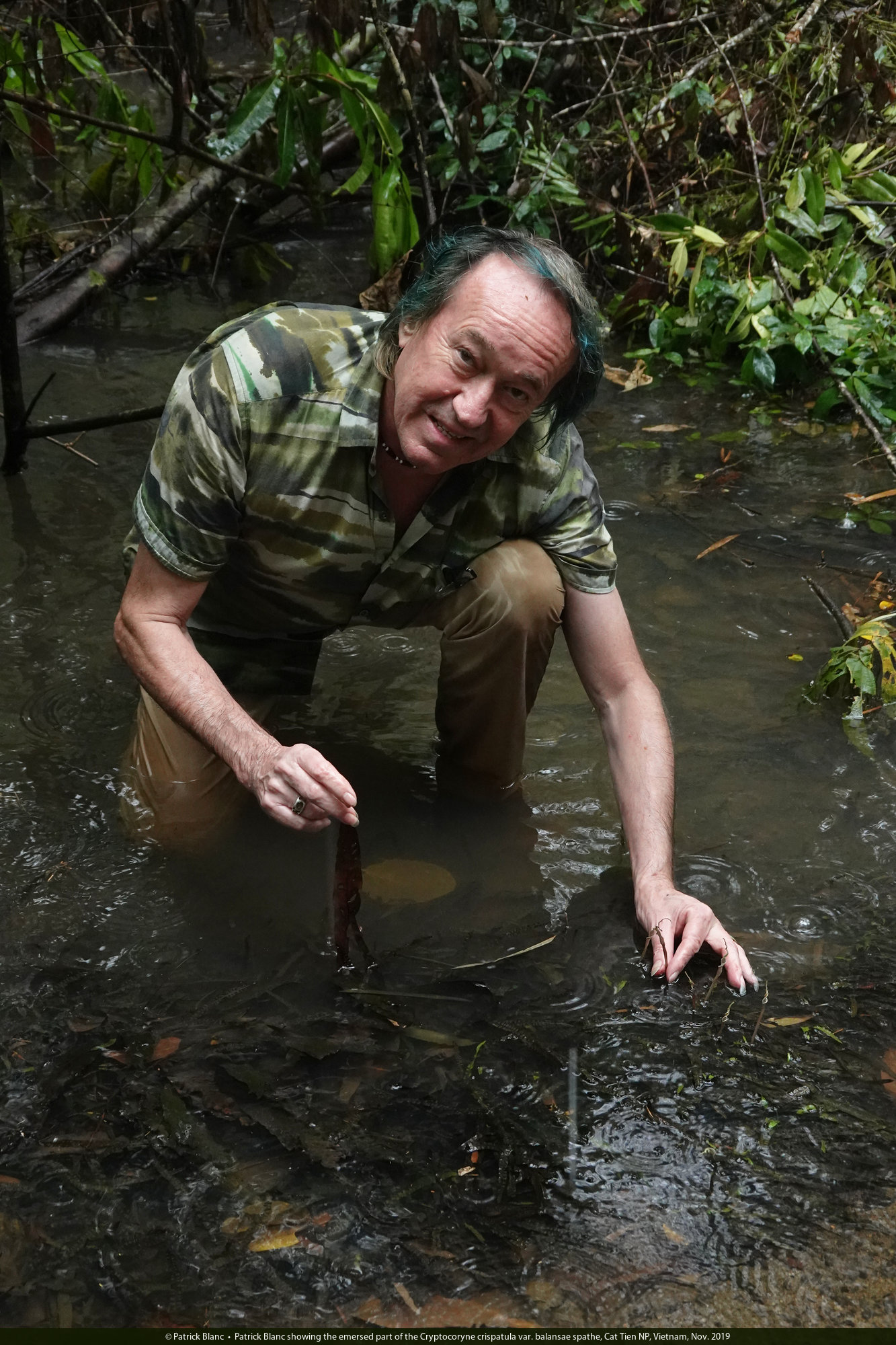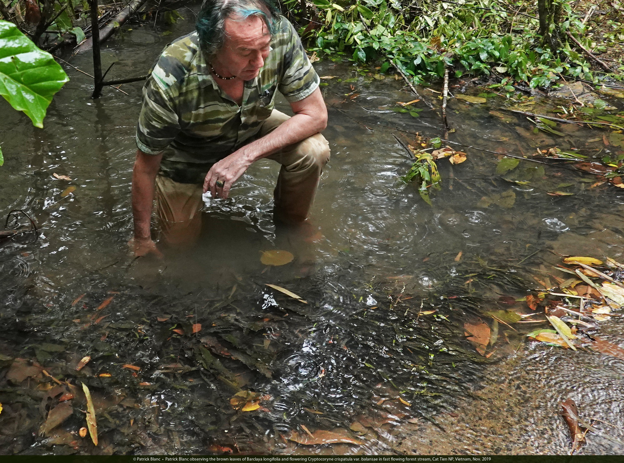 Patrick Blanc observing the brown leaves of Barclaya longifolia and flowering Cryptocoryne crispatula var. balansae in fast flowing forest stream, Cat Tien NP, Vietnam, Nov. 2019