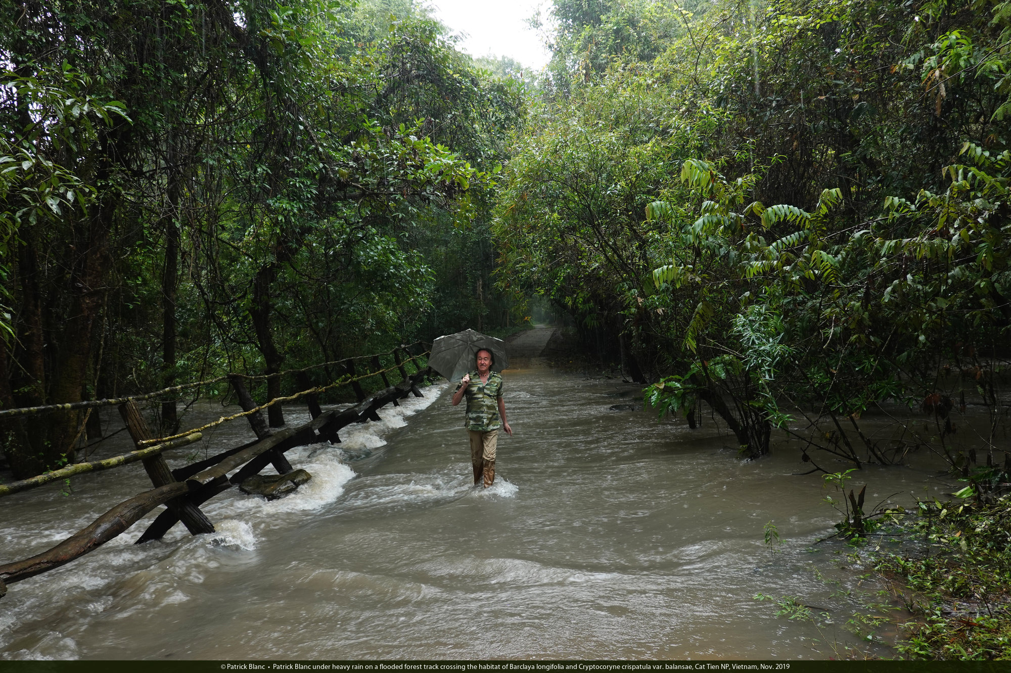 Patrick Blanc under heavy rain on a flooded forest track crossing the habitat of Barclaya longifolia and Cryptocoryne crispatula var. balansae, Cat Tien NP, Vietnam, Nov. 2019
