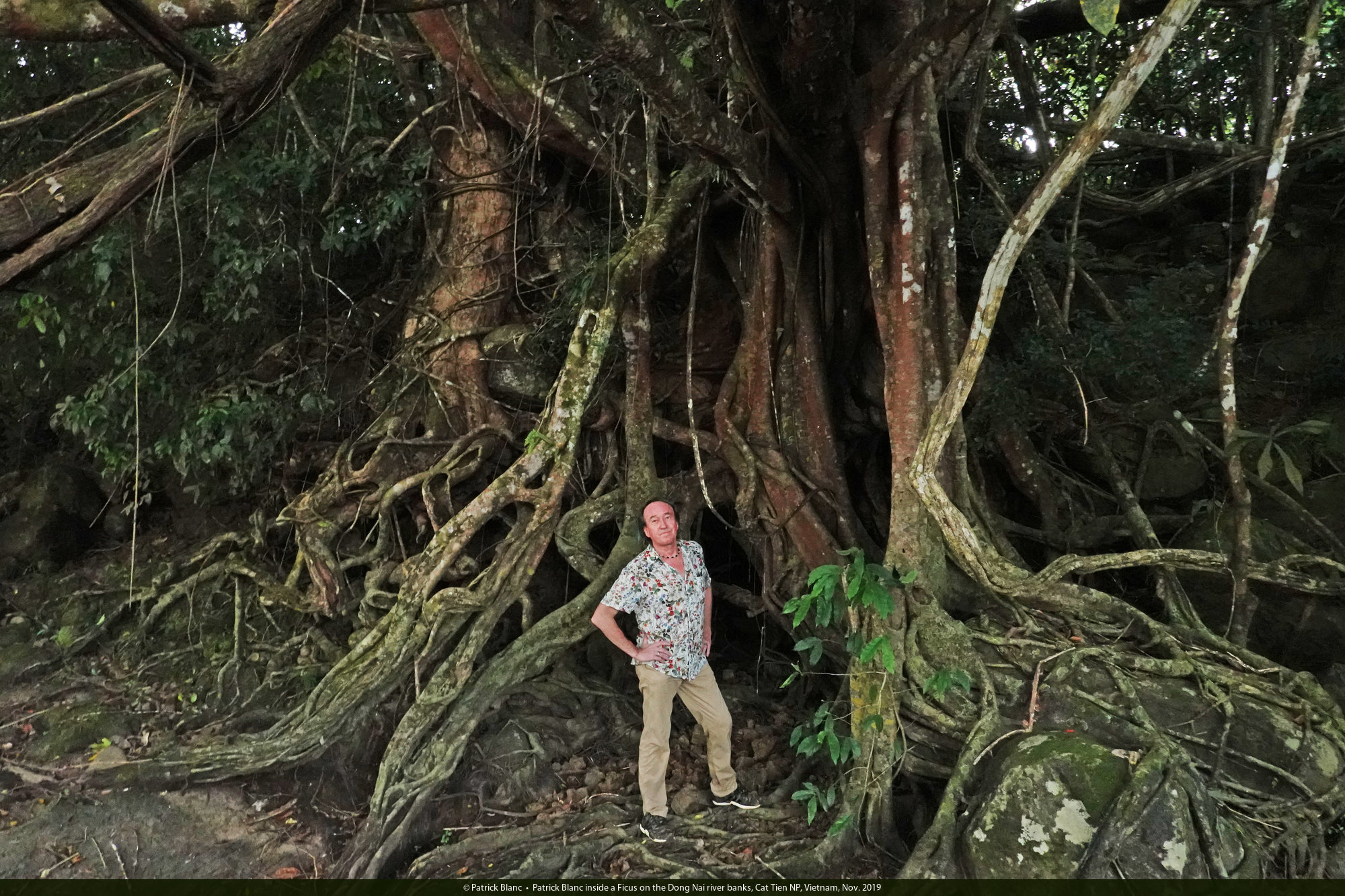 Patrick Blanc inside a Ficus on the Dong Nai river banks, Cat Tien NP, Vietnam, Nov. 2019