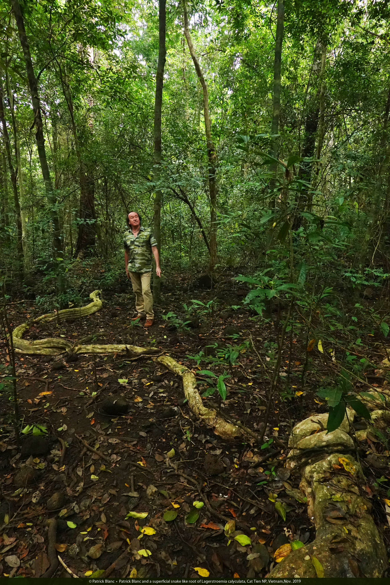 Patrick Blanc and a superficial snake like root of Lagerstroemia calyculata, Cat Tien NP, Vietnam,Nov. 2019