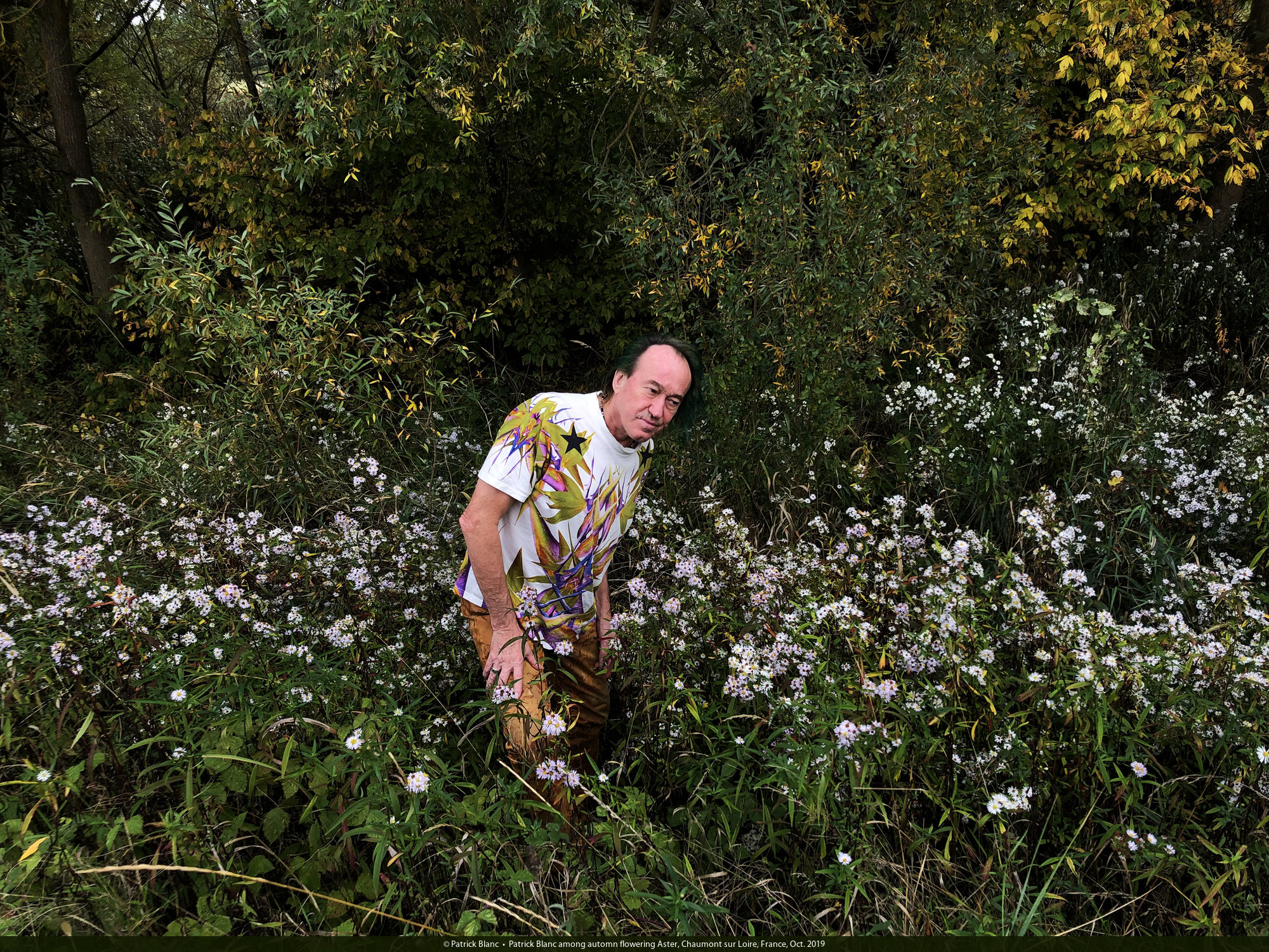 Patrick Blanc among automn flowering Aster, Chaumont sur Loire, France, Oct. 2019