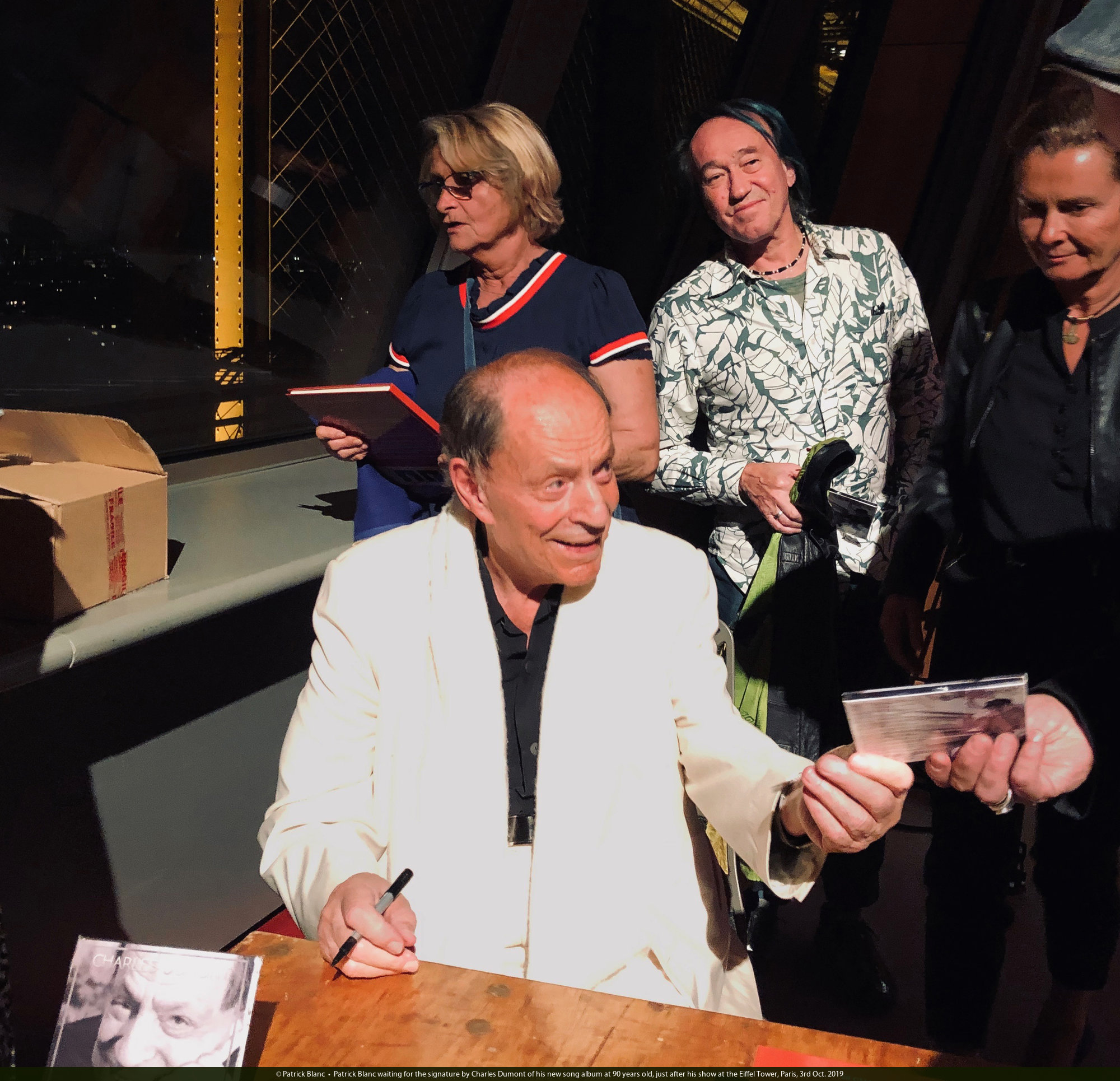 Patrick Blanc waiting for the signature by Charles Dumont of his new song album at 90 years old, just after his show at the Eiffel Tower, Paris, 3rd Oct. 2019