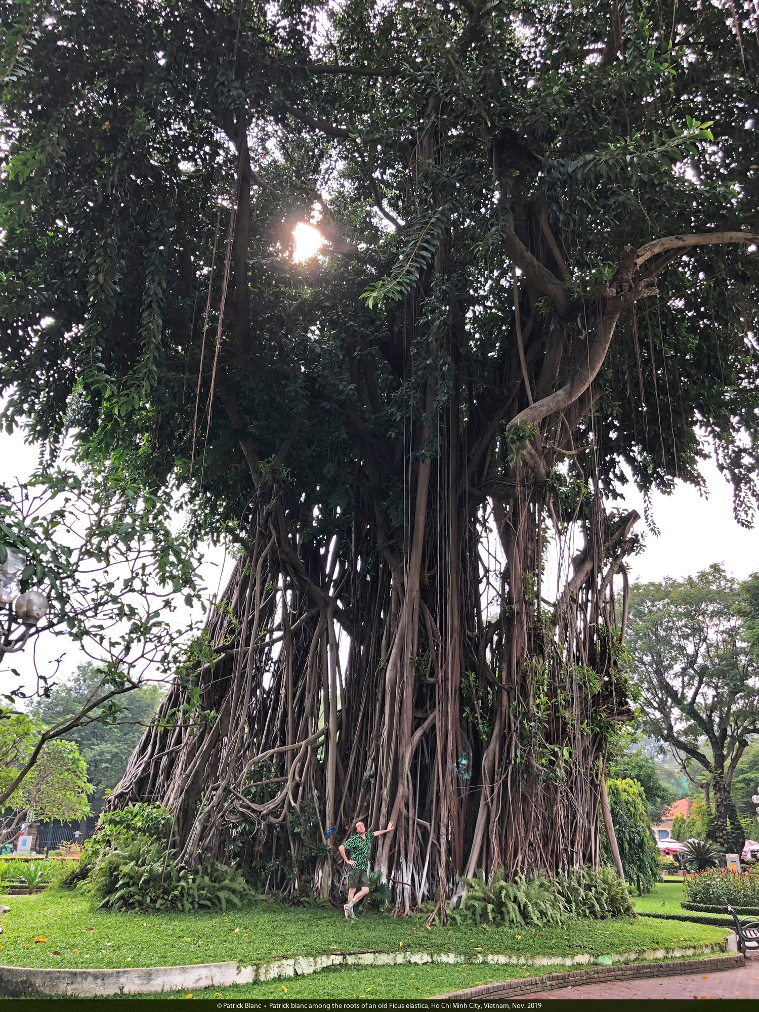 Patrick blanc among the roots of an old Ficus elastica, Ho Chi Minh City, Vietnam, Nov. 2019
