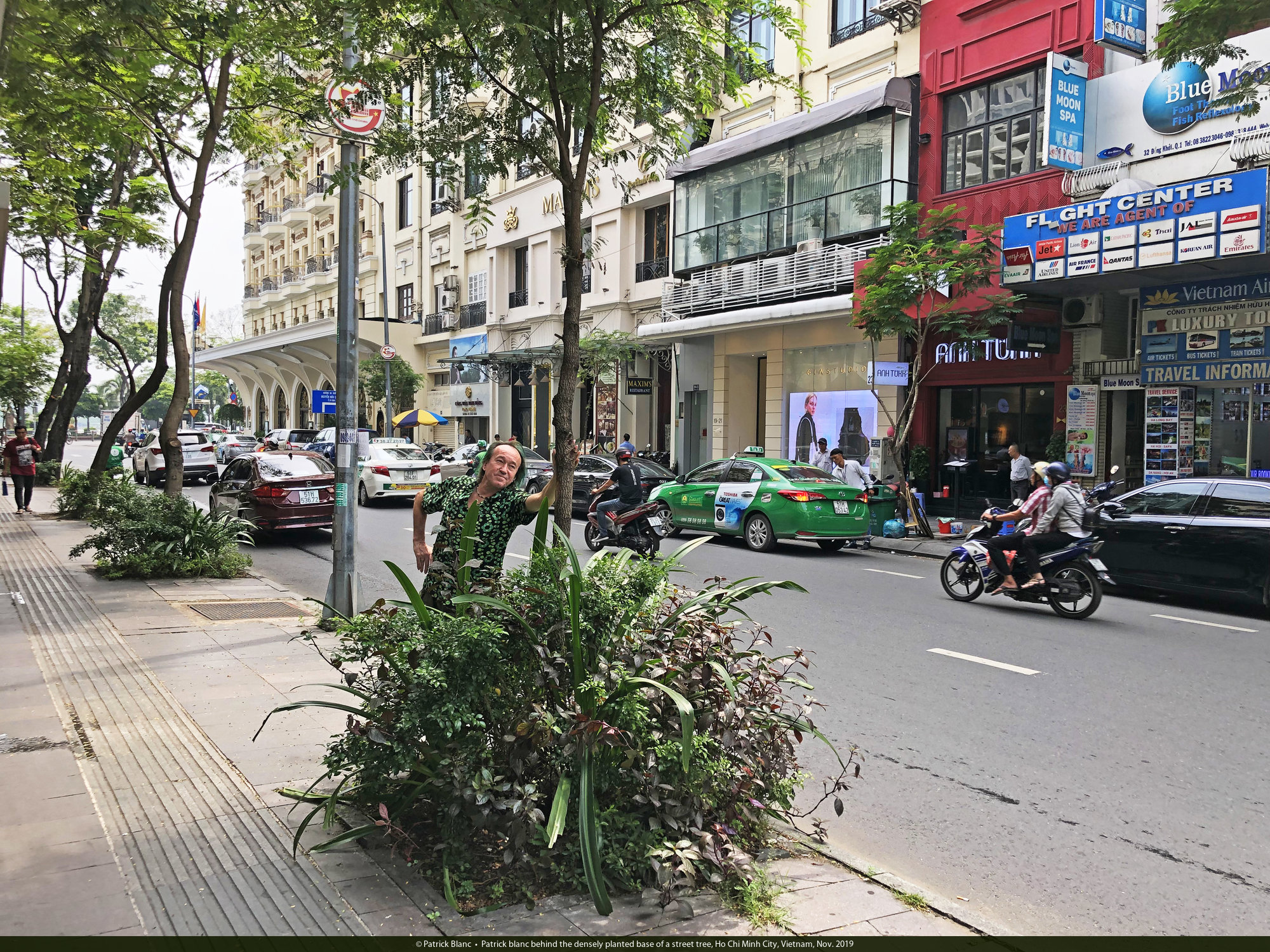 Patrick blanc behind the densely planted base of a street tree, Ho Chi Minh City, Vietnam, Nov. 2019