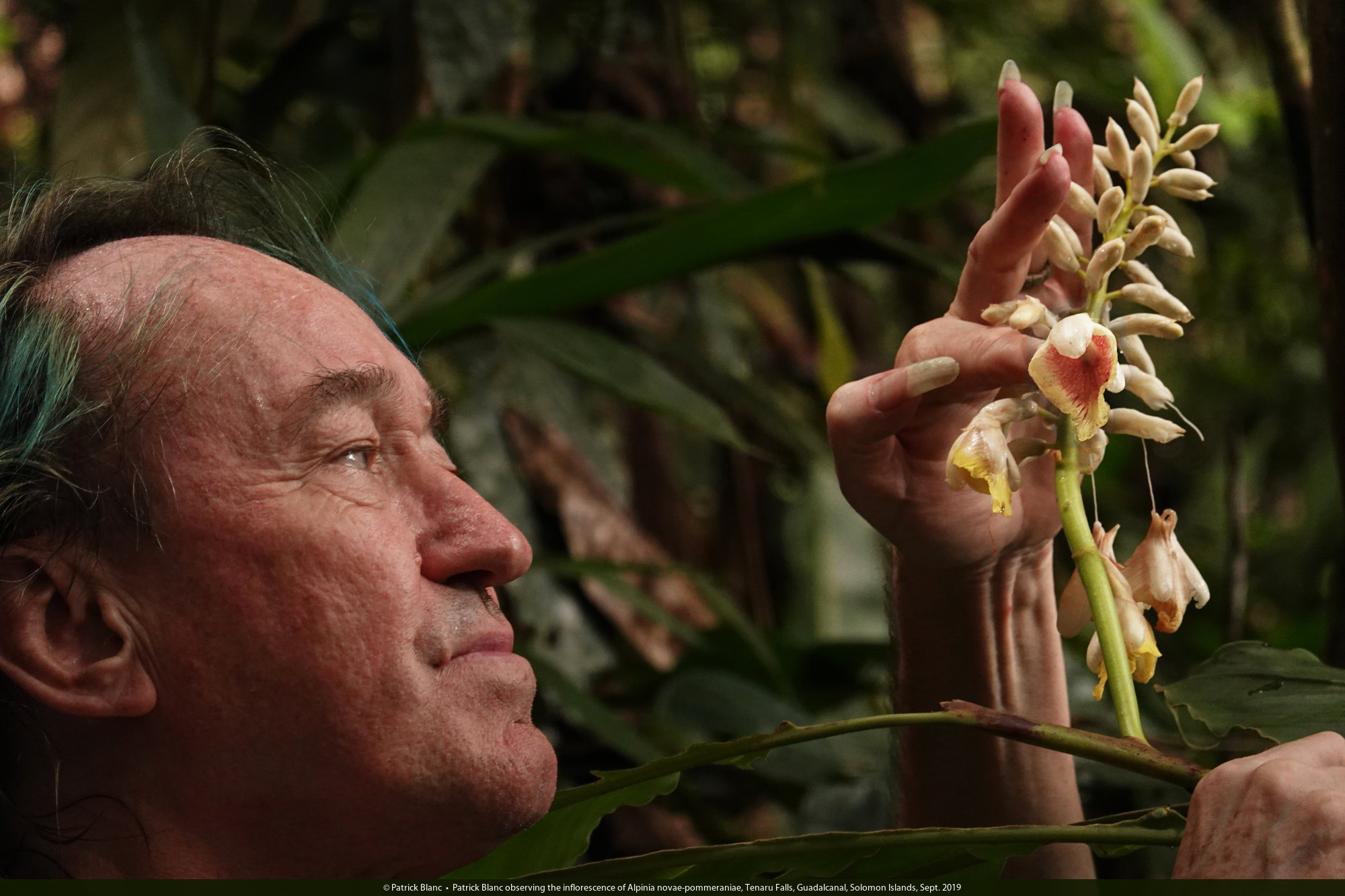 Patrick Blanc observing the inflorescence of Alpinia novae-pommeraniae, Tenaru Falls, Guadalcanal, Solomon Islands, Sept. 2019