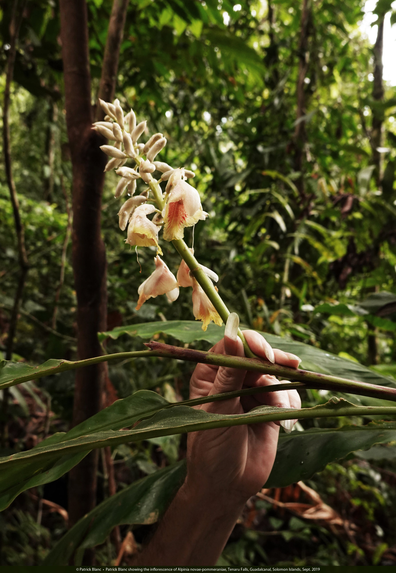 Patrick Blanc showing the inflorescence of Alpinia novae-pommeraniae, Tenaru Falls, Guadalcanal, Solomon Islands, Sept. 2019