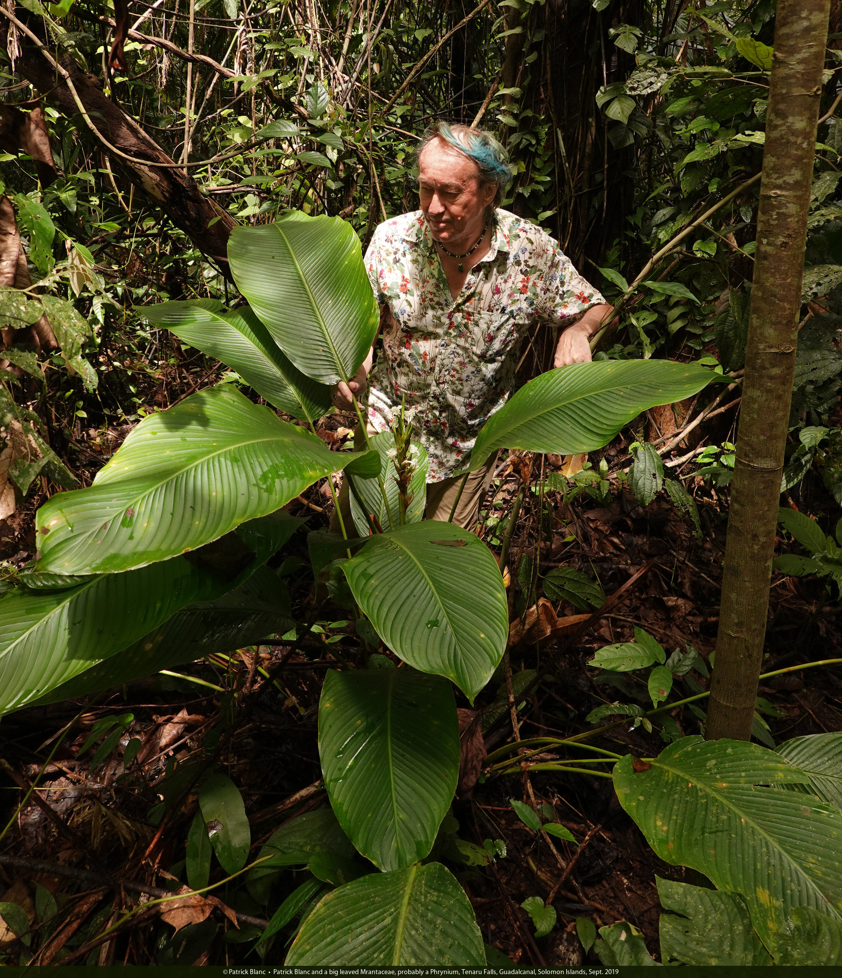 Patrick Blanc and a big leaved Mrantaceae, probably a Phrynium, Tenaru Falls, Guadalcanal, Solomon Islands, Sept. 2019
