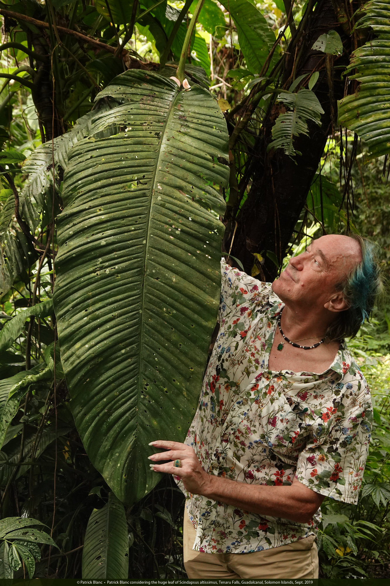 Patrick Blanc considering the huge leaf of Scindapsus altissimus, Tenaru Falls, Guadalcanal, Solomon Islands, Sept. 2019