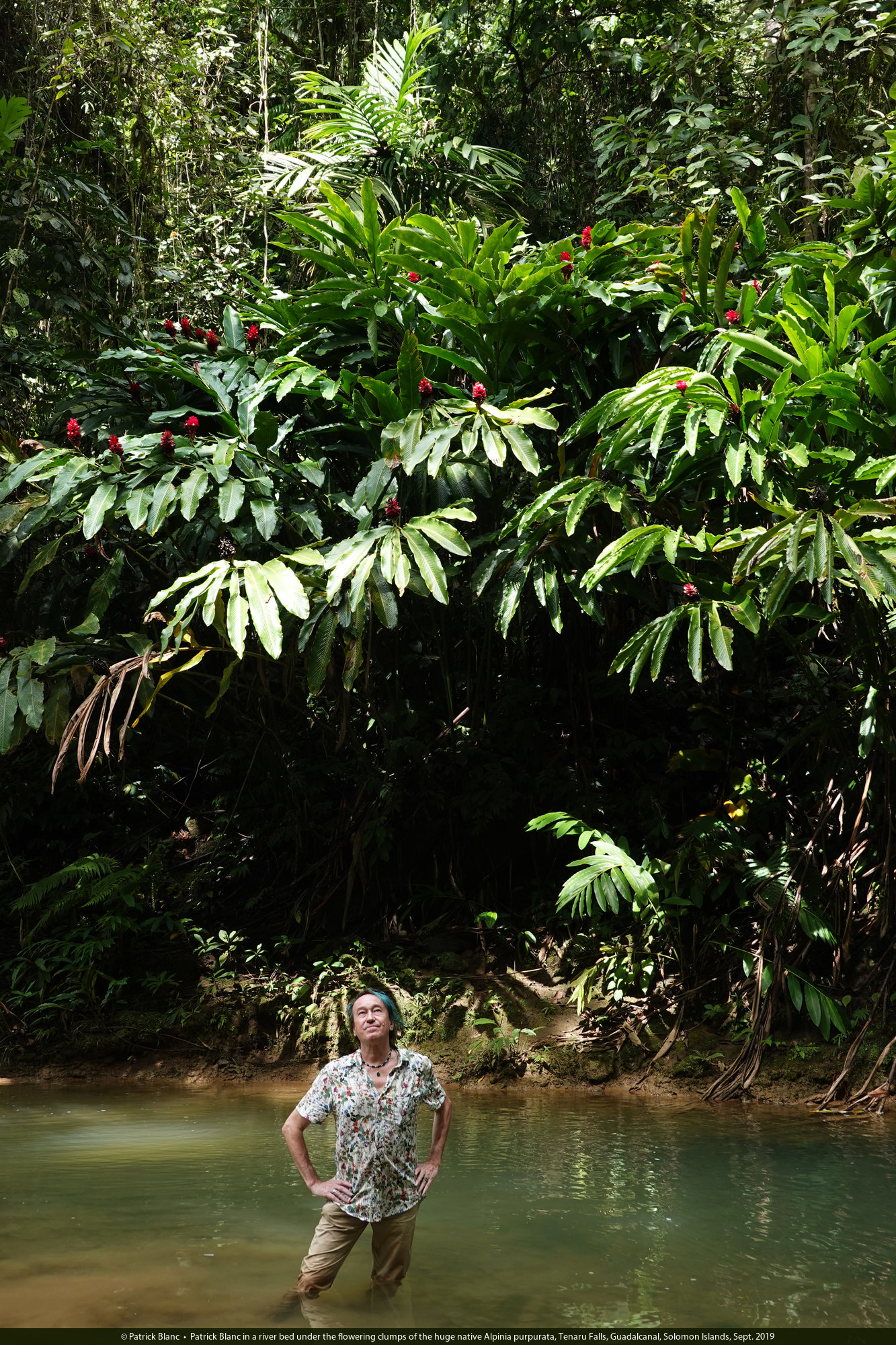 Patrick Blanc in a river bed under the flowering clumps of the huge native Alpinia purpurata, Tenaru Falls, Guadalcanal, Solomon Islands, Sept. 2019