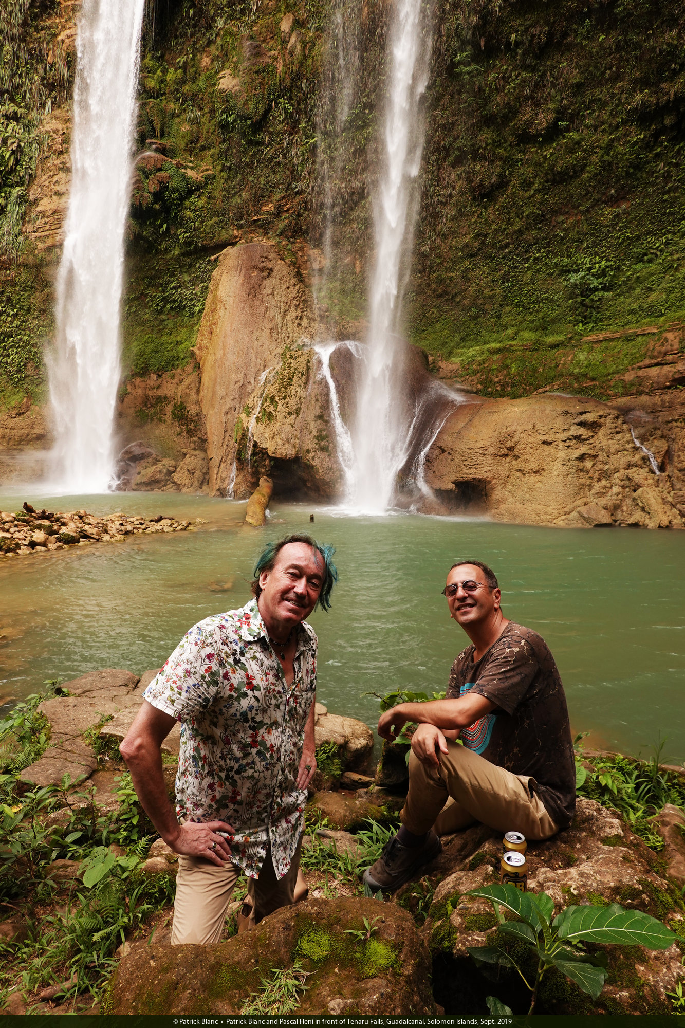 Patrick Blanc and Pascal Heni in front of Tenaru Falls, Guadalcanal, Solomon Islands, Sept. 2019
