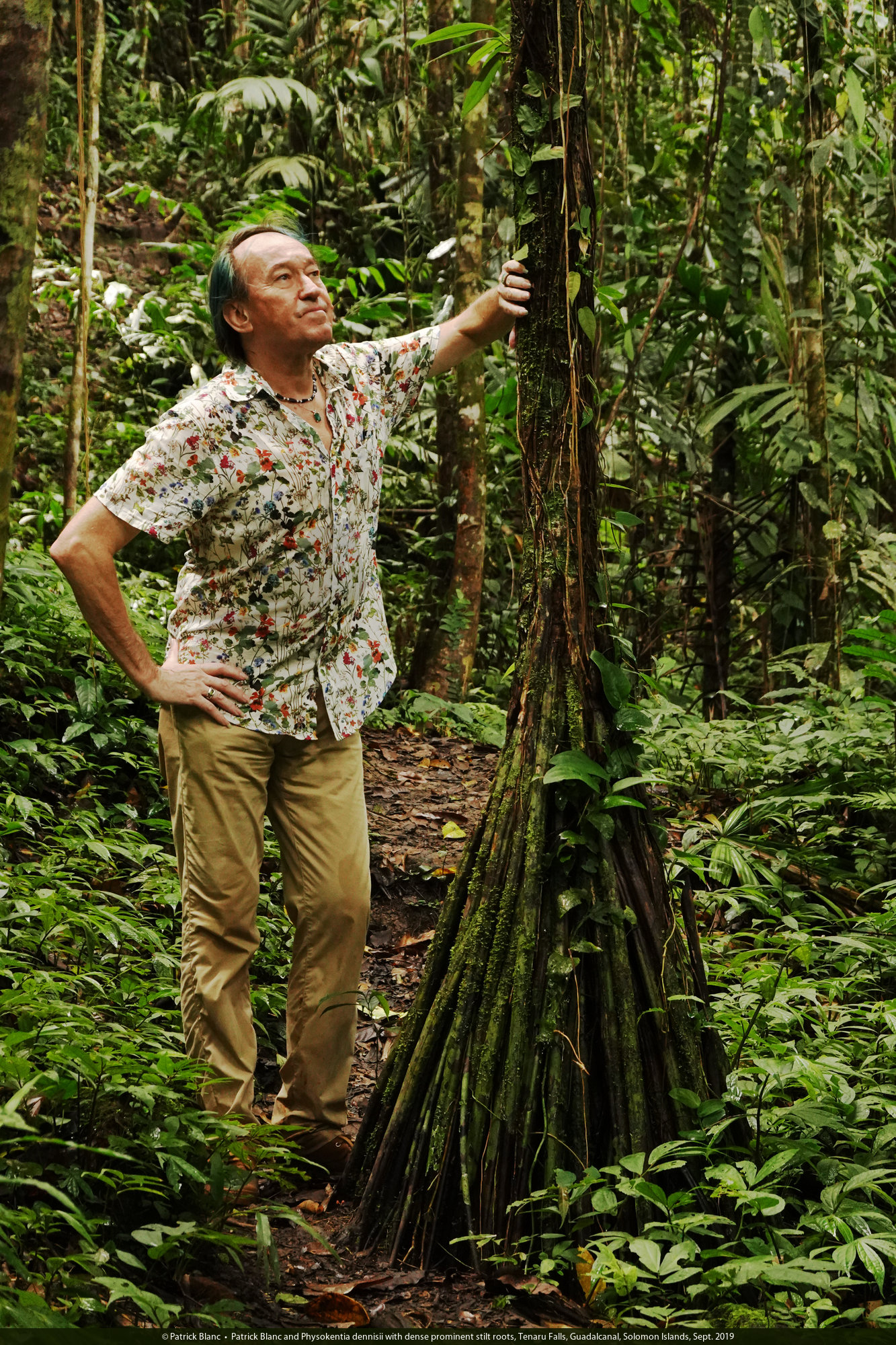 Patrick Blanc and Physokentia dennisii with dense prominent stilt roots, Tenaru Falls, Guadalcanal, Solomon Islands, Sept. 2019