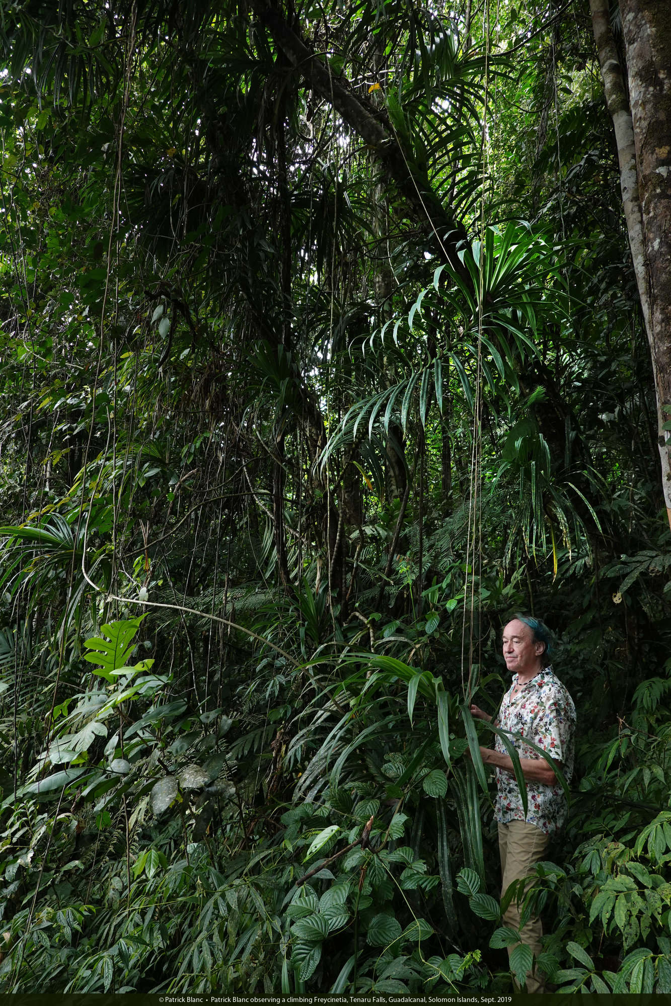 Patrick Blanc observing a climbing Freycinetia, Tenaru Falls, Guadalcanal, Solomon Islands, Sept. 2019