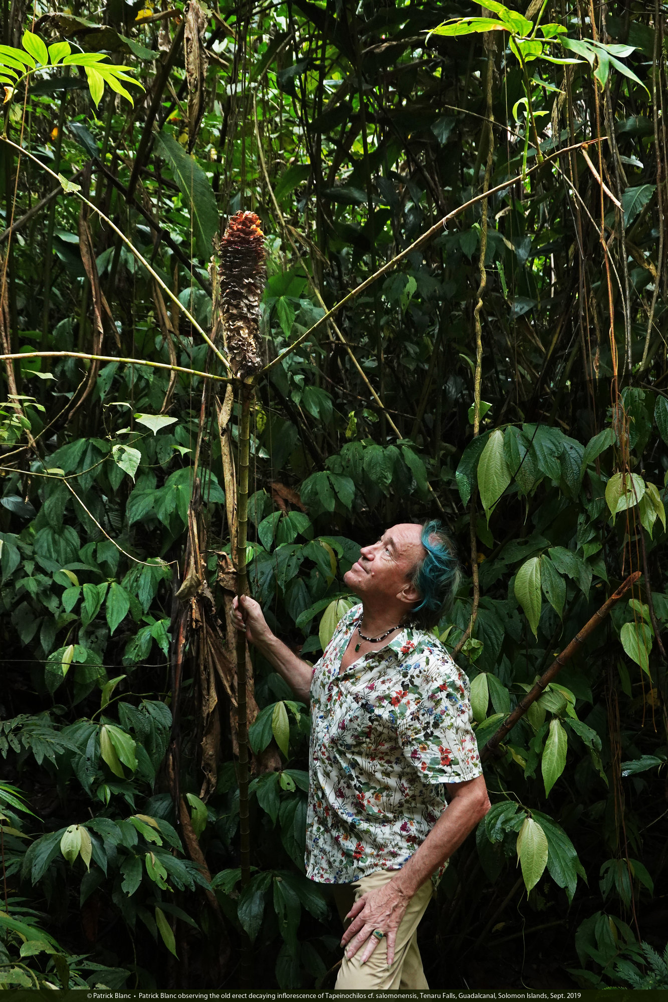 Patrick Blanc observing the old erect decaying inflorescence of Tapeinochilos cf. salomonensis, Tenaru Falls, Guadalcanal, Solomon Islands, Sept. 2019