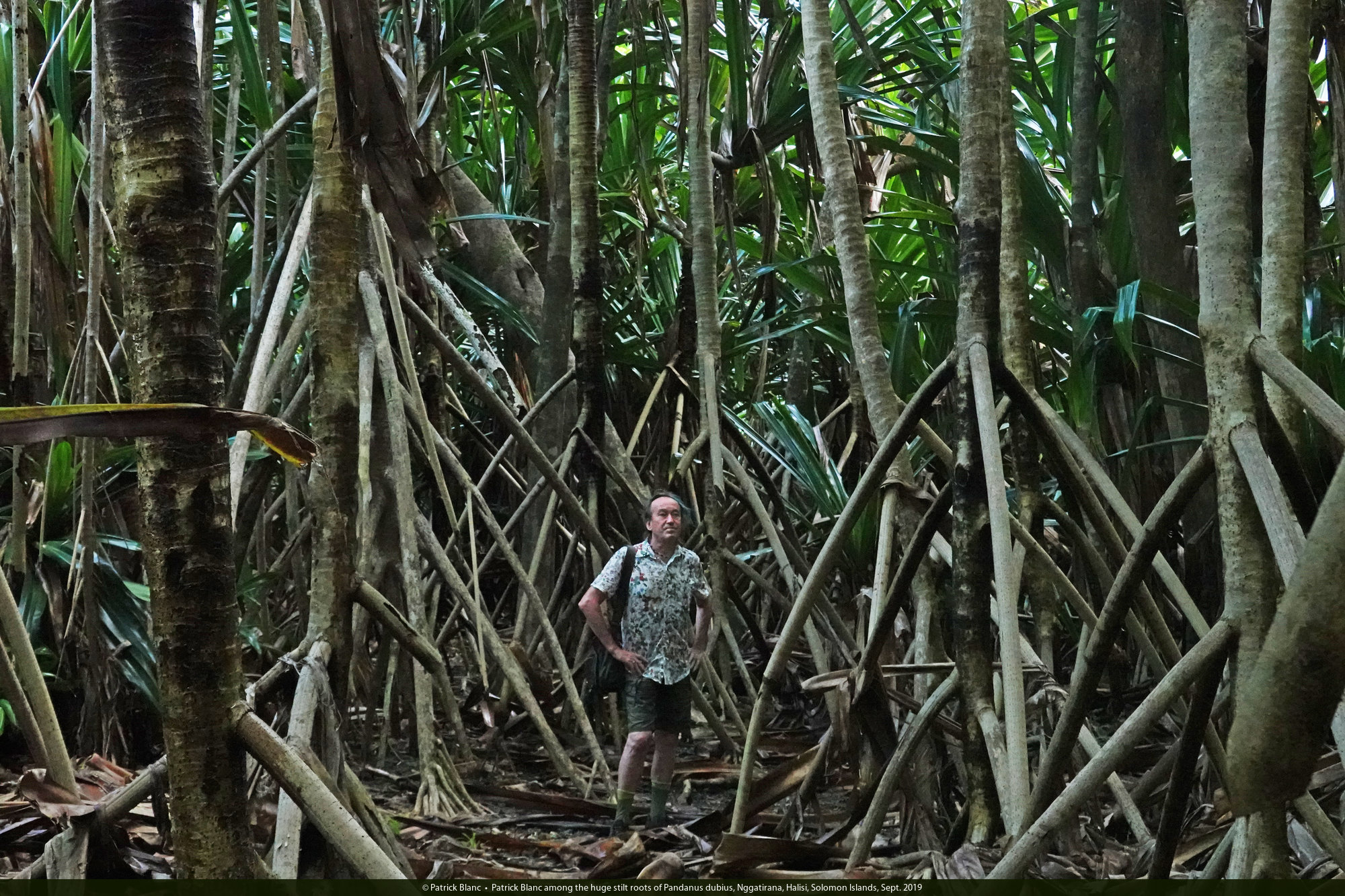 Patrick Blanc among the huge stilt roots of Pandanus dubius, Nggatirana, Halisi, Solomon Islands, Sept. 2019