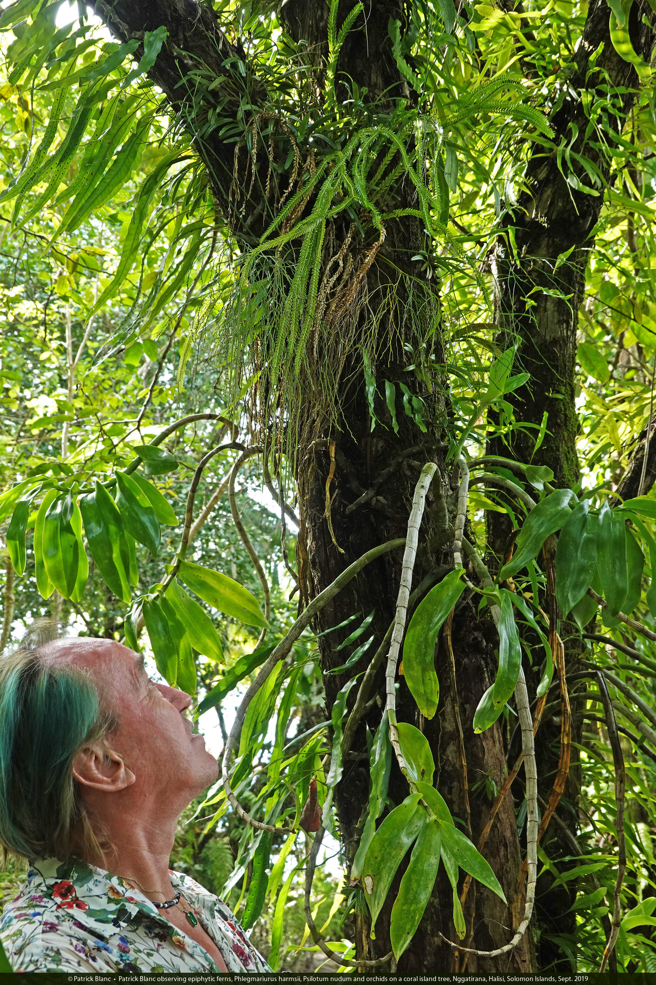 Patrick Blanc observing epiphytic ferns, Phlegmariurus harmsii, Psilotum nudum and orchids on a coral island tree, Nggatirana, Halisi, Solomon Islands, Sept. 2019