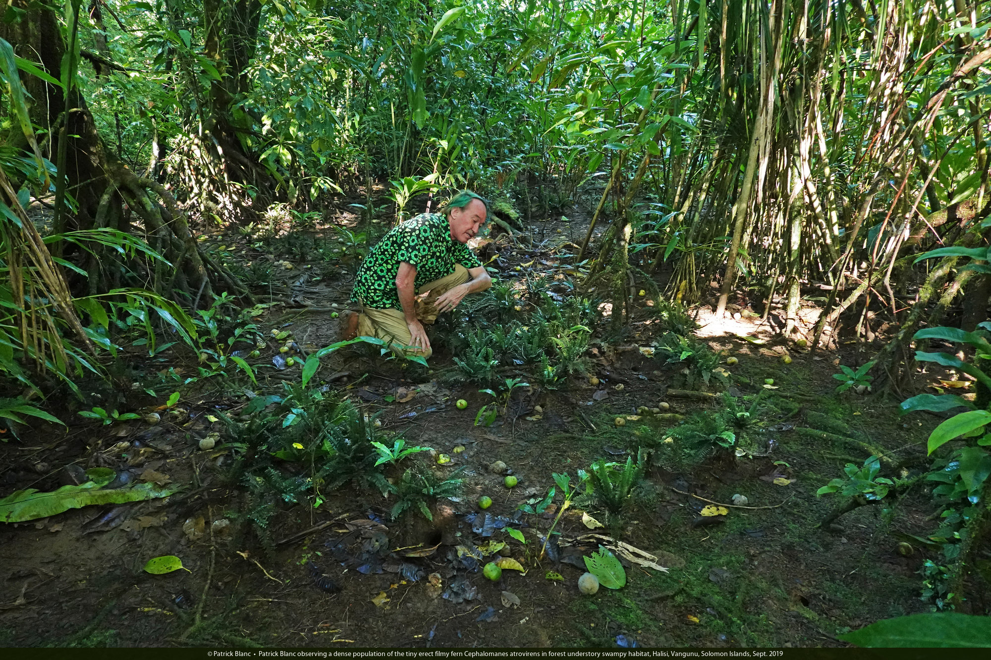 Patrick Blanc observing a dense population of the tiny erect filmy fern Cephalomanes atrovirens in forest understory swampy habitat, Halisi, Vangunu, Solomon Islands, Sept. 2019