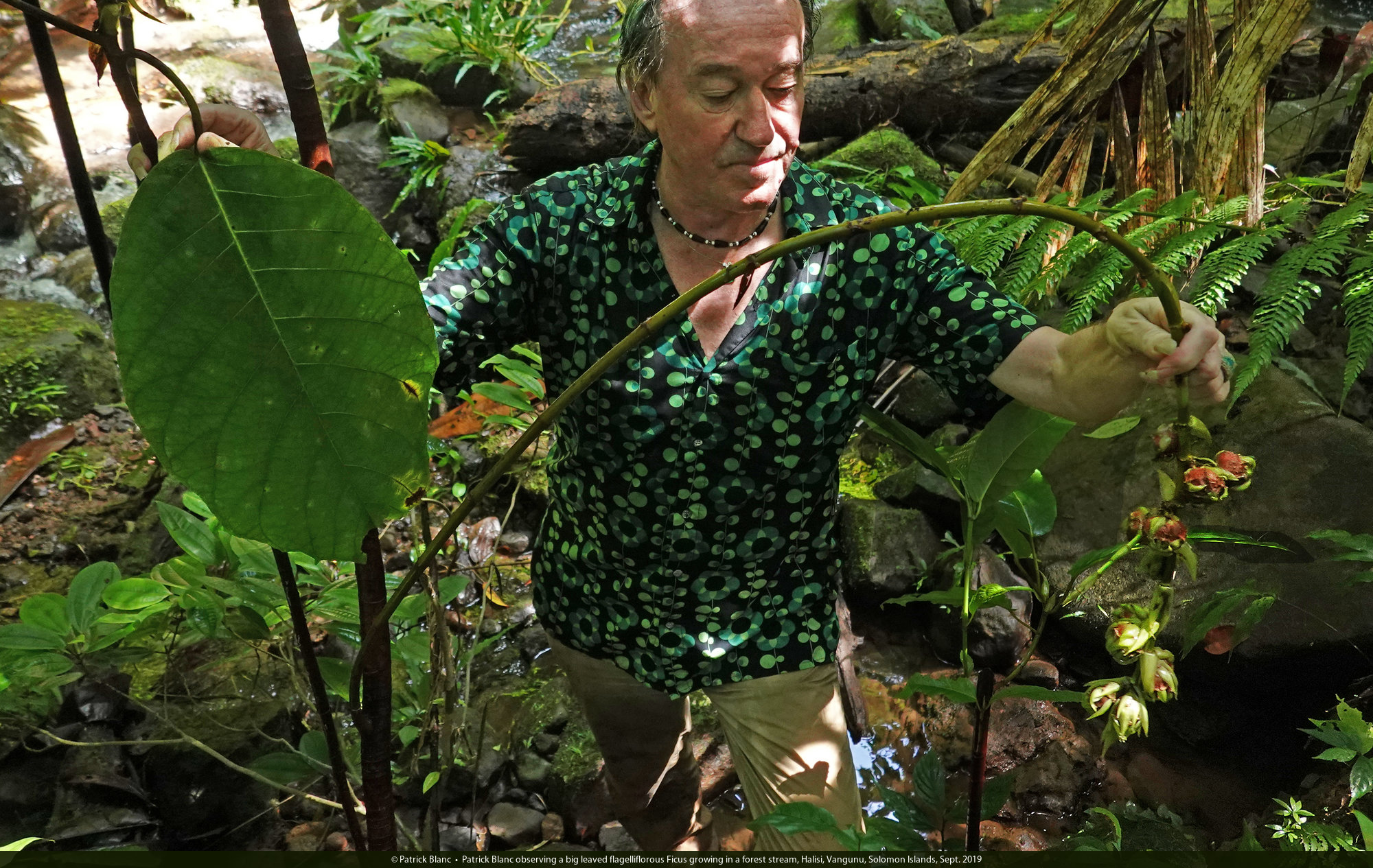 Patrick Blanc observing a big leaved flagelliflorous Ficus growing in a forest stream, Halisi, Vangunu, Solomon Islands, Sept. 2019