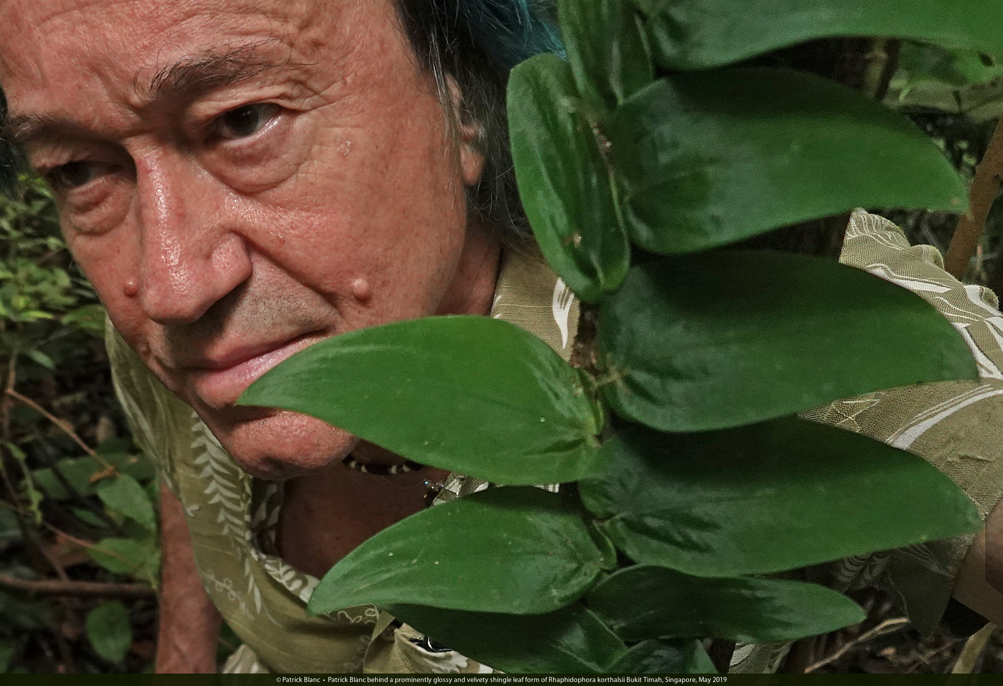 Patrick Blanc behind a prominently glossy and velvety shingle leaf form of Rhaphidophora korthalsii Bukit Timah, Singapore, May 2019
