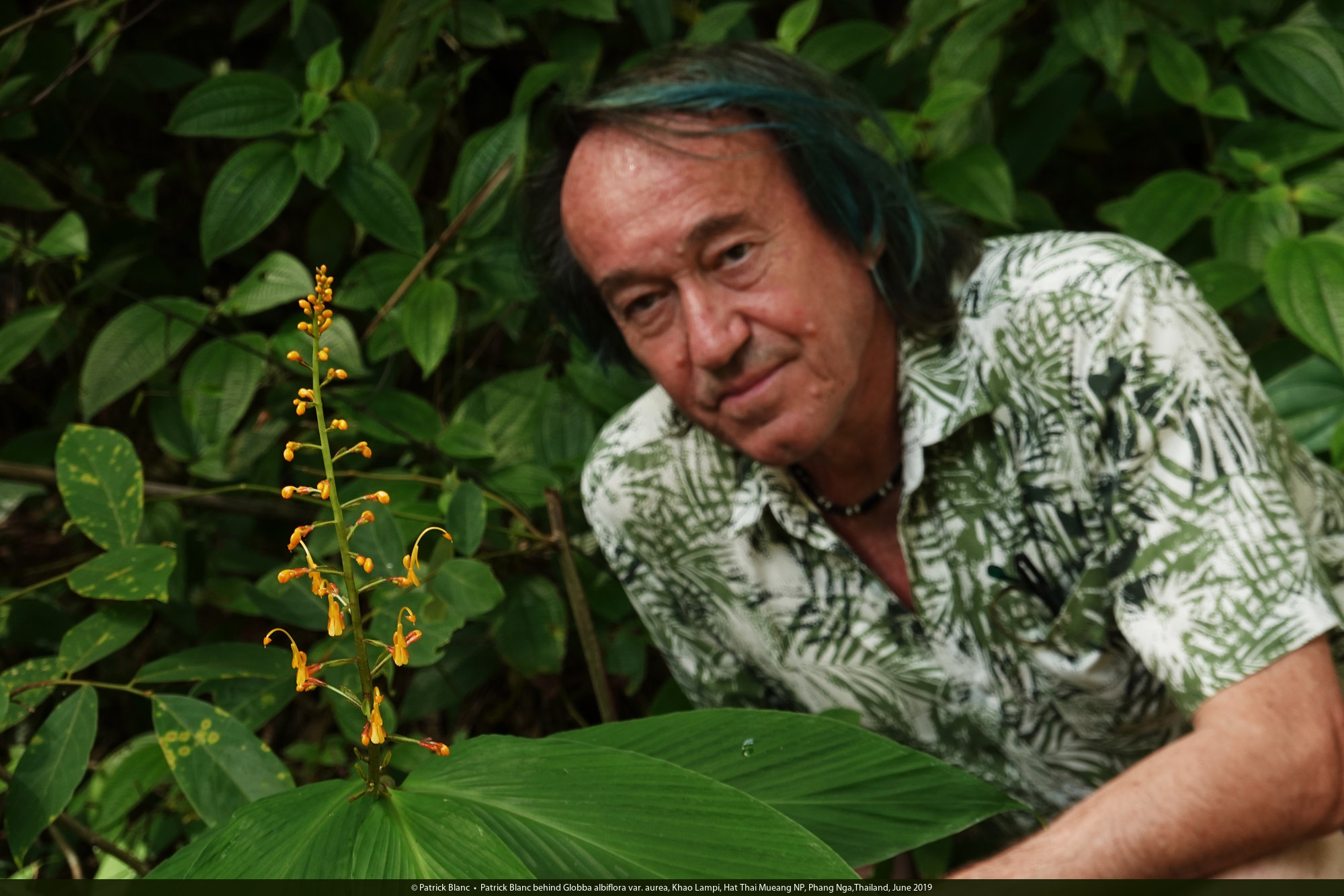 Patrick Blanc behind Globba albiflora var. aurea, Khao Lampi, Hat Thai Mueang NP, Phang Nga,Thailand, June 2019