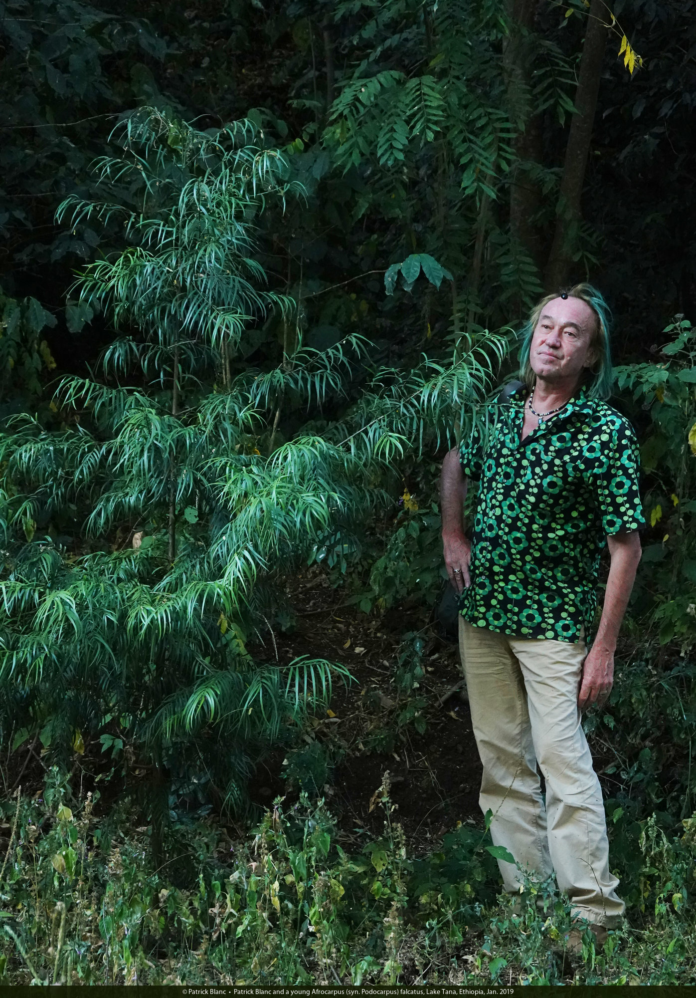 Patrick Blanc and a young Afrocarpus (syn. Podocarpus) falcatus, Lake Tana, Ethiopia, Jan. 2019