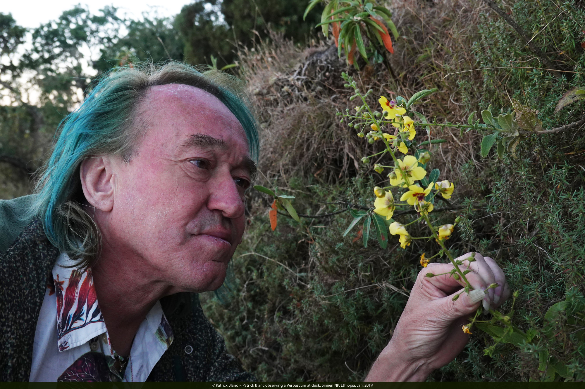 Patrick Blanc observing a Verbascum at dusk, Simien NP, Ethiopia, Jan. 2019