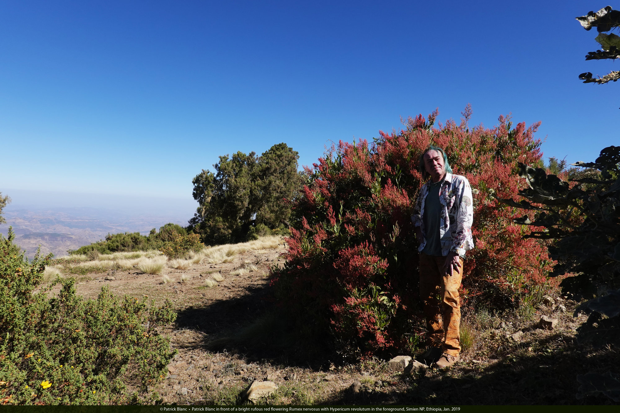 Patrick Blanc in front of a bright rufous red flowering Rumex nervosus with Hypericum revolutum in the foreground, Simien NP, Ethiopia, Jan. 2019