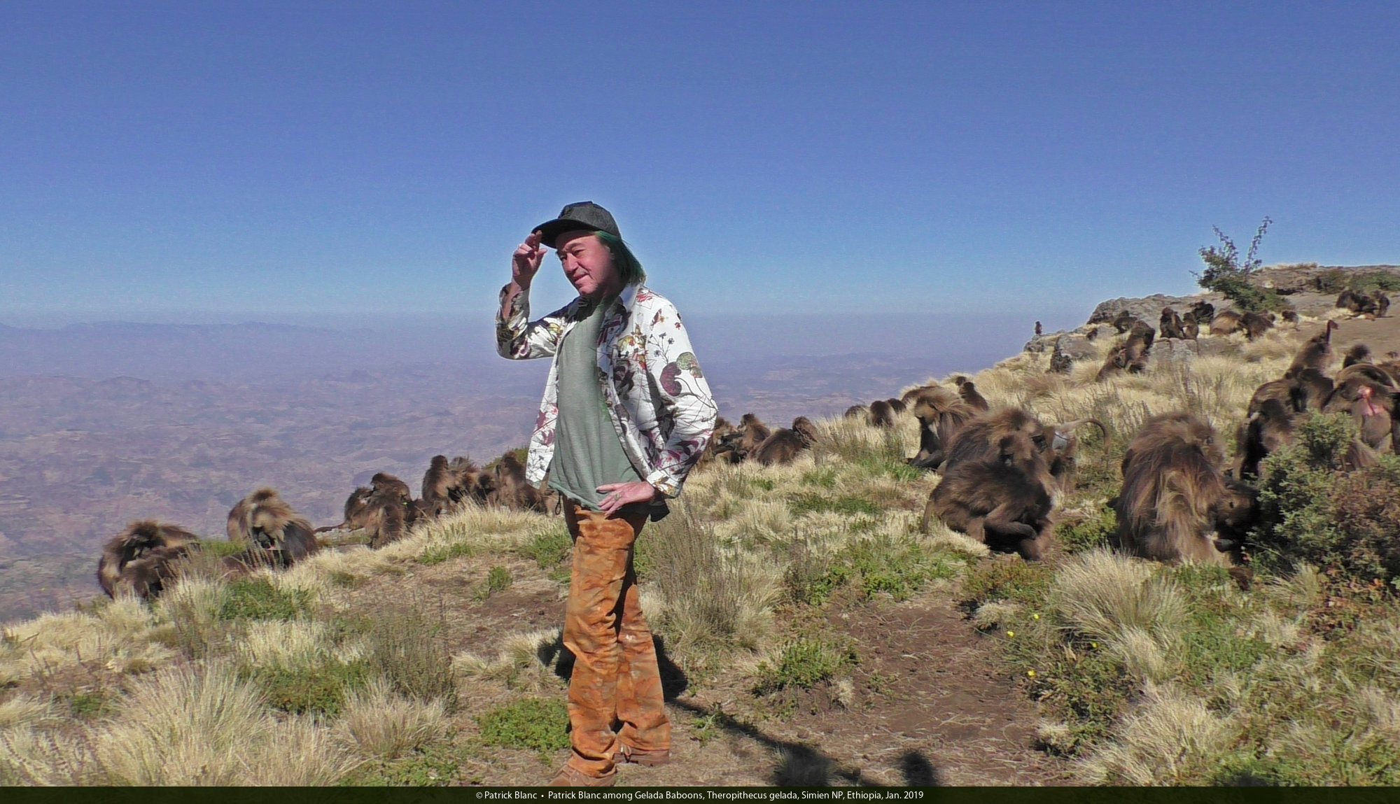 Patrick Blanc among Gelada Baboons, Theropithecus gelada, Simien NP, Ethiopia, Jan. 2019