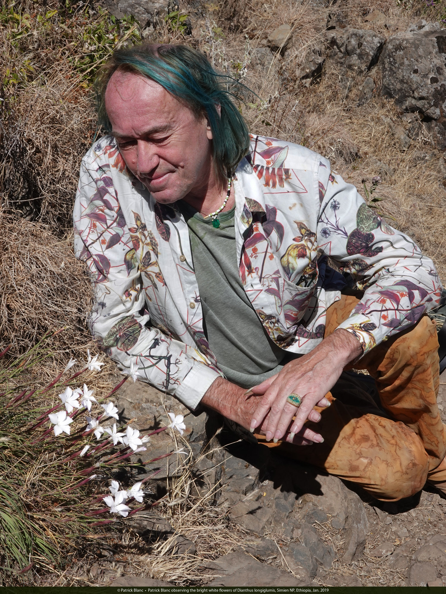 Patrick Blanc observing the bright white feathery inflorescence of Plectocephalus varians, Simien NP, Ethiopia, Jan. 2019