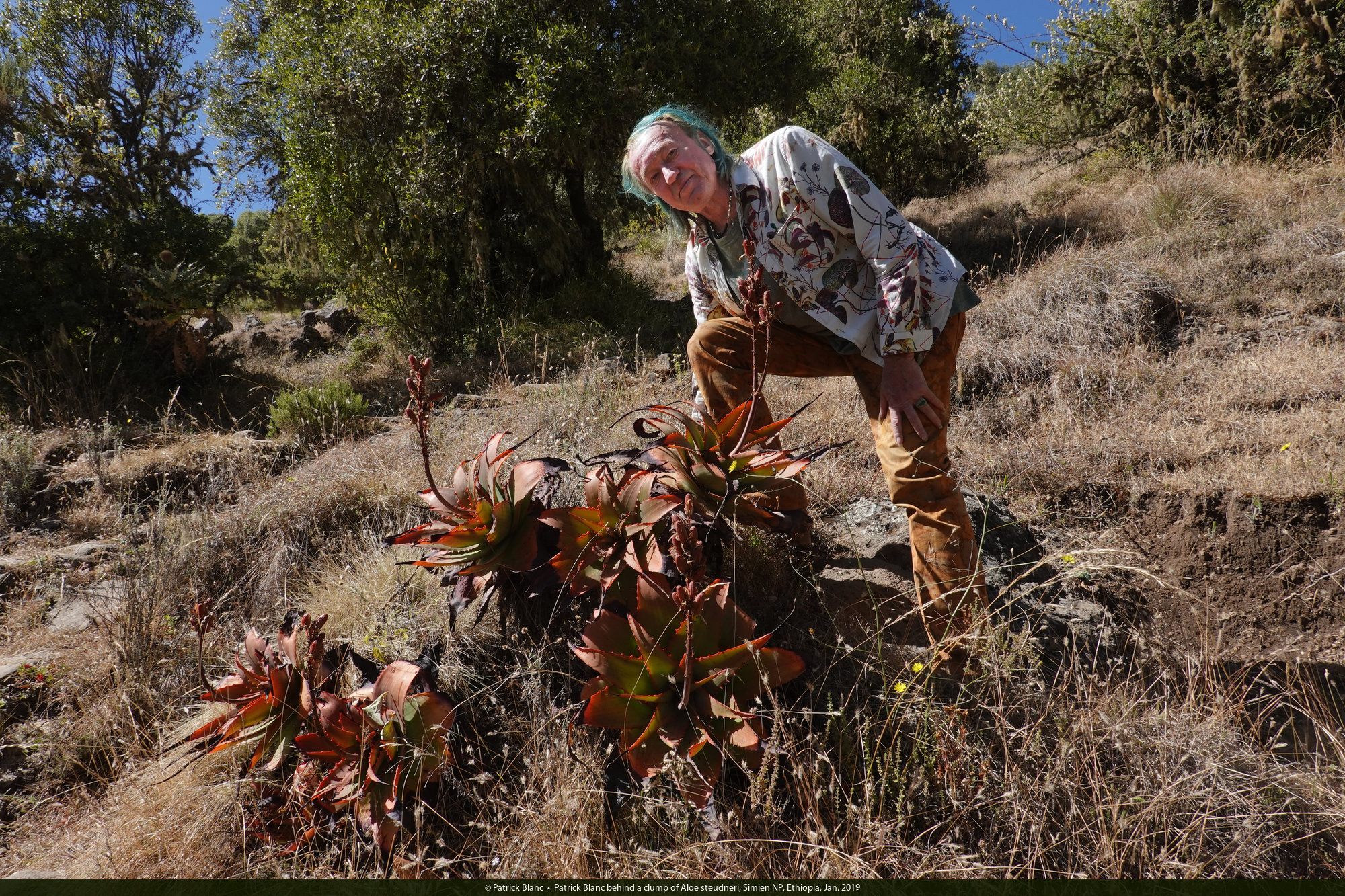 Patrick Blanc behind a clump of Aloe steudneri, Simien NP, Ethiopia, Jan. 2019