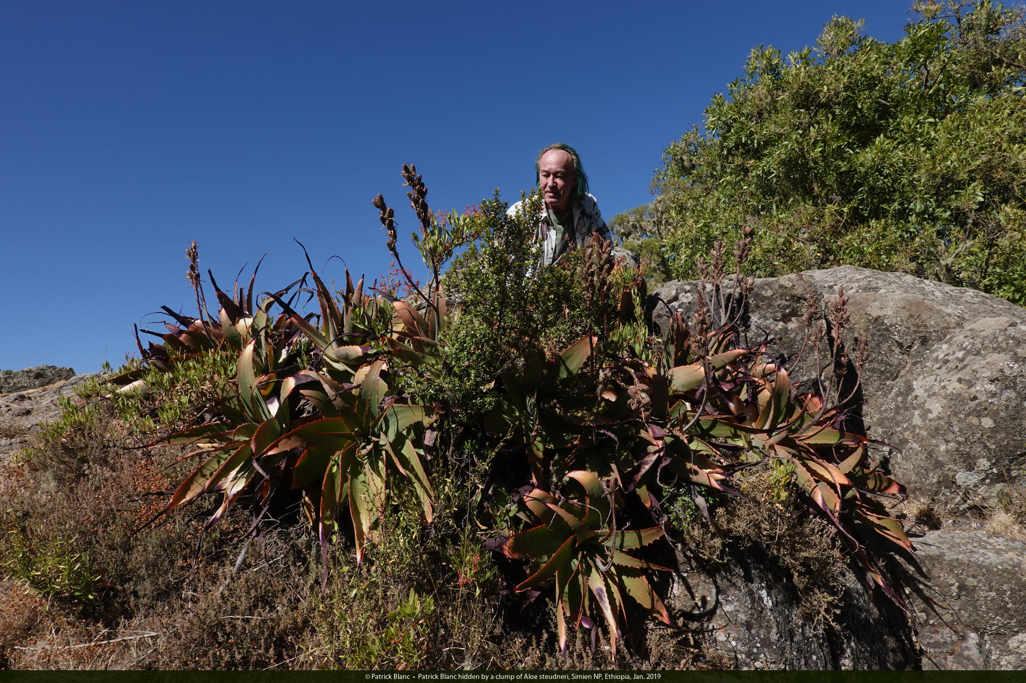Patrick Blanc hidden by a clump of Aloe steudneri, Simien NP, Ethiopia, Jan. 2019