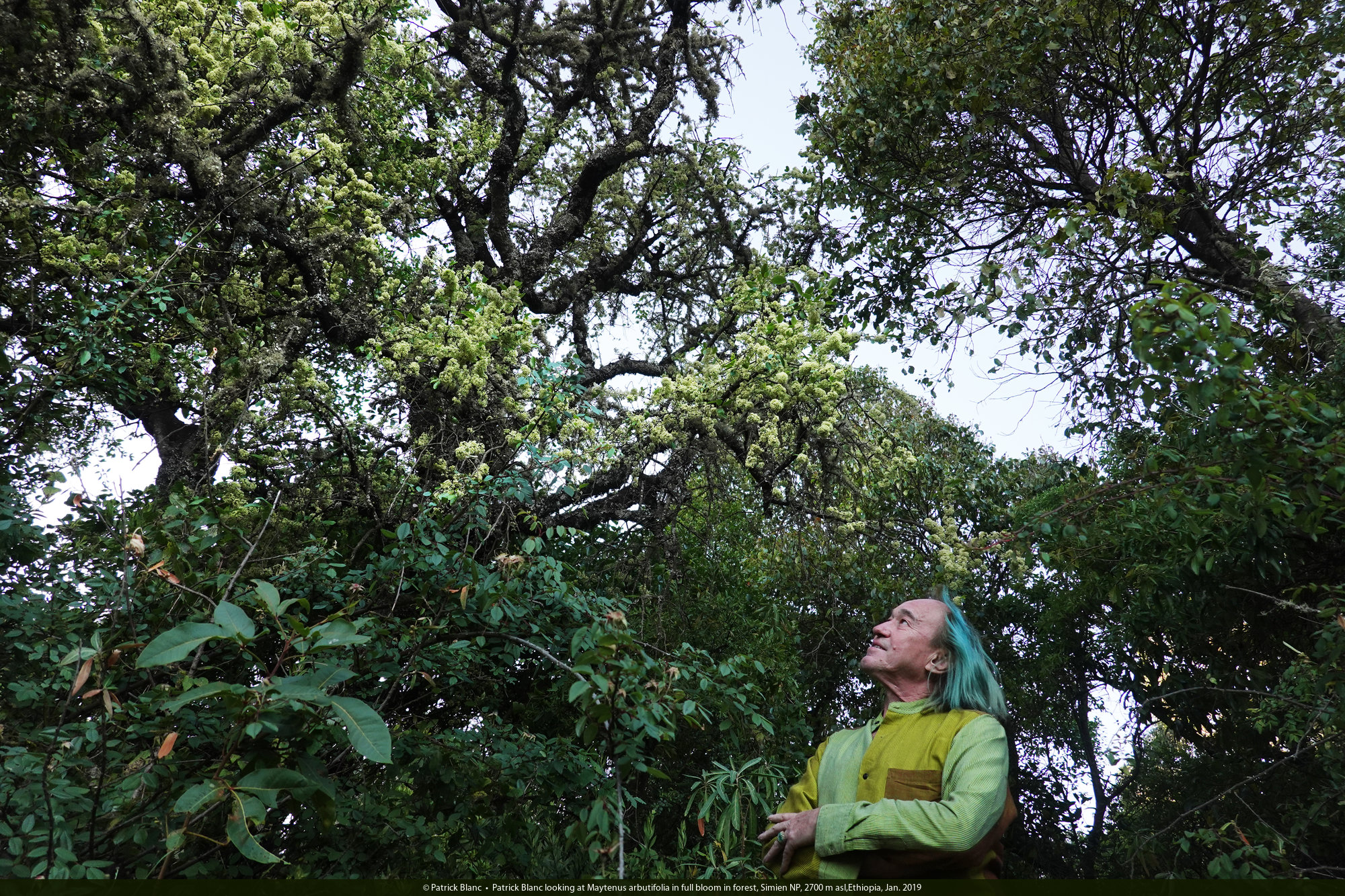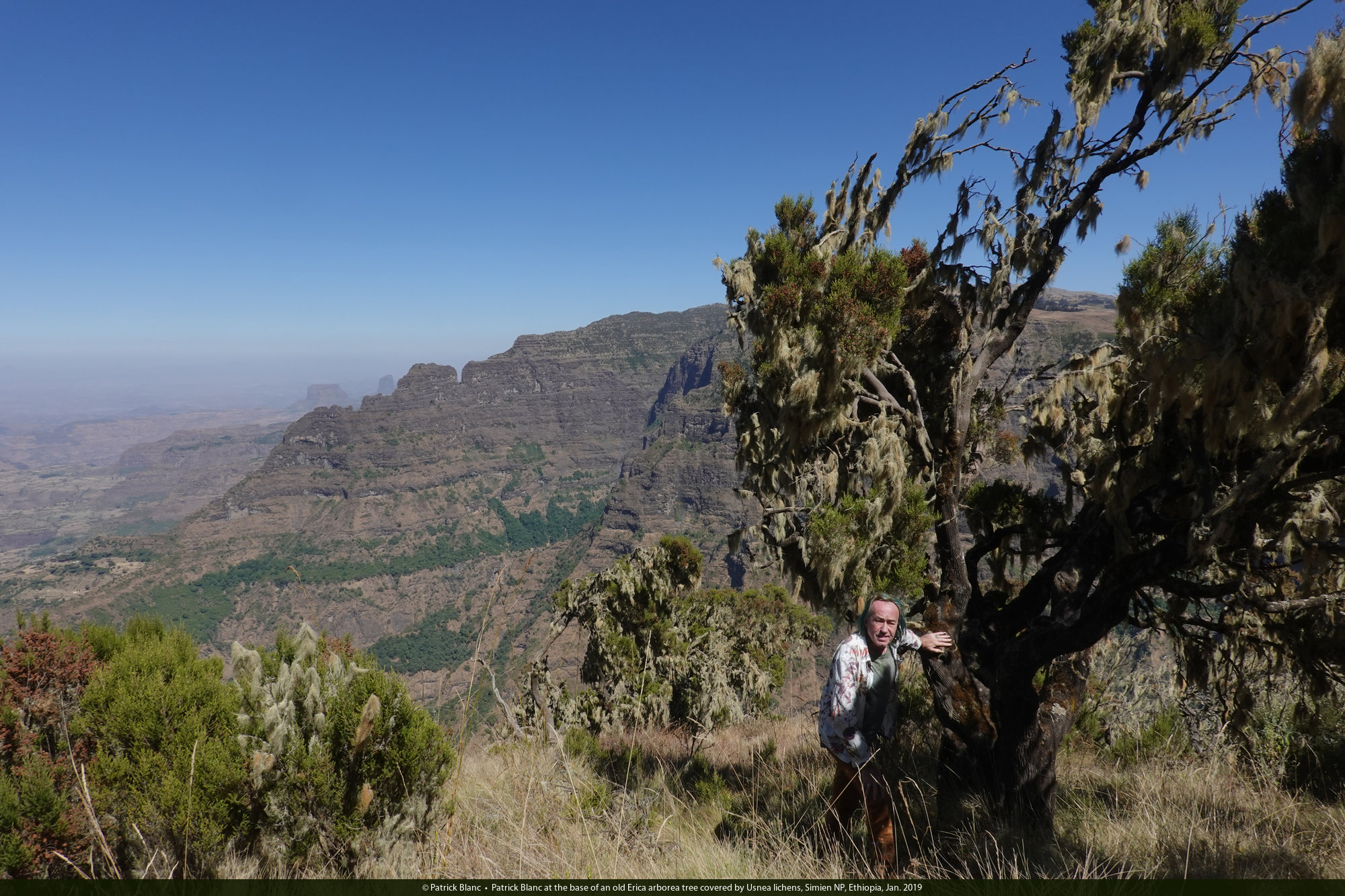 Patrick Blanc at the base of an old Erica arborea tree covered by Usnea lichens, Simien NP, Ethiopia, Jan. 2019