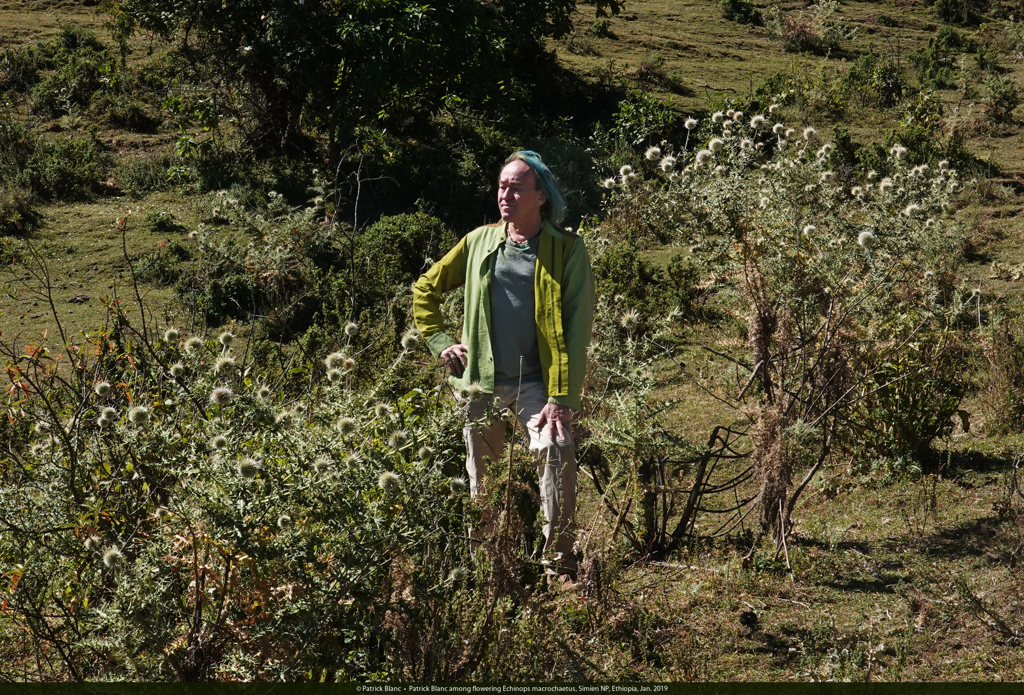 Patrick Blanc among flowering Echinops macrochaetus, Simien NP, Ethiopia, Jan. 2019