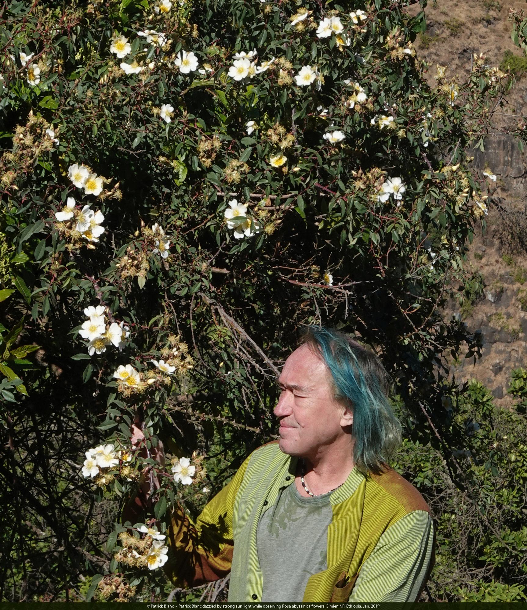 Patrick Blanc dazzled by strong sun light while observing Rosa abyssinica flowers, Simien NP, Ethiopia, Jan. 2019